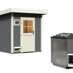 Der moderne Ofen sorgt mit seiner 8000 Watt Leistung für wohltuende Wärme bis zu 90 °C. Der Ofen lässt sich leicht steuern. Das Außengehäuse besteht aus beschichtetem Eisen und wird von einem stabilen Holzrahmen umrandet. Das verleiht der Sauna ein schickes Design.