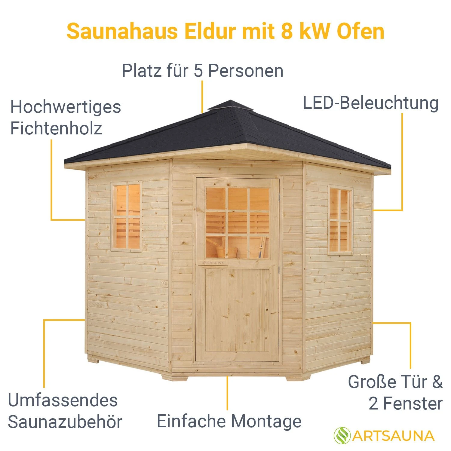 Mit dem modernen Outdoor Saunahaus Eldur schaffen Sie sich außen Ihre eigene Wellness-Oase. Erleben Sie den gesunden und erholsamen Saunagang zuhause zu allen Jahreszeiten in einer natürlichen Umgebung. Werden Sie eins mit der Natur und genießen Sie dabei den Sonnenuntergang. Je nach Wetterlage kühlen Sie sich danach gleich draußen ab. Bei großen Temperaturunterschieden zwischen außen und in der Outdoor Sauna ist das besonders vitalisierend. Auch wer im Haus keinen Platz für eine Sauna hat, fährt mit der Außensauna für 5 Personen richtig. Das Zubehör wie Thermometer, Sanduhr, Kelle und Aufgusseimer runden das Komplett-Set ab.