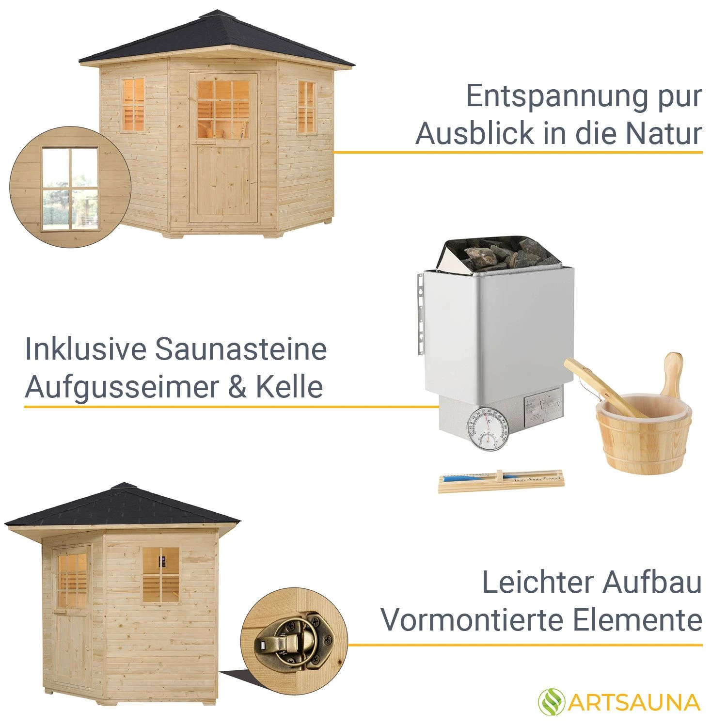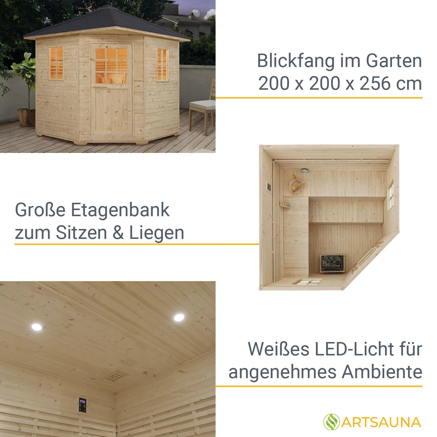 - Gesamtmaße Gartensauna: 200 x 200 x 256 cm (BxTxH)