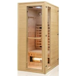 Die Massivholzsauna besteht aus heller Fichte. Dieses formstabile Holz eignet sich perfekt für den Außenbereich, da es Wärme zurückgibt und innerhalb der Kabine hält. Zusammen mit der effizienten Wärmedämmung und der wasserabweisenden Eigenschaft schafft das Holz ein angenehmes Raumklima.