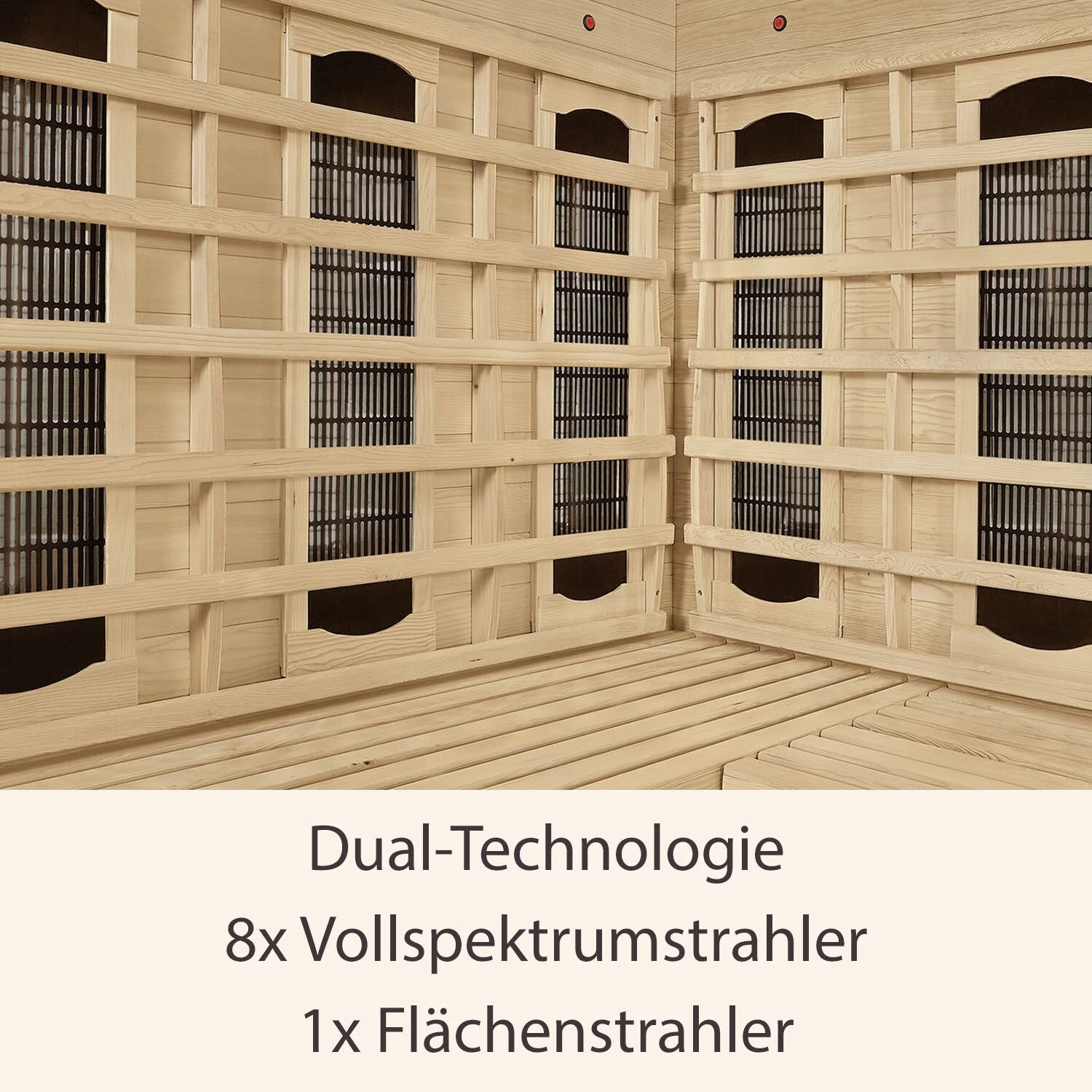 Die insgesamt 8 Vollspektrumstrahler sorgen für eine intensive Tiefenwärme, die tief in Ihren Körper eindringt und so Verspannungen im Rücken- und Wadenbereich lösen kann. Zeitgleich erzeugt der milde Flächenstrahler im Boden eine angenehme Wärme innerhalb der gesamten Kabine.