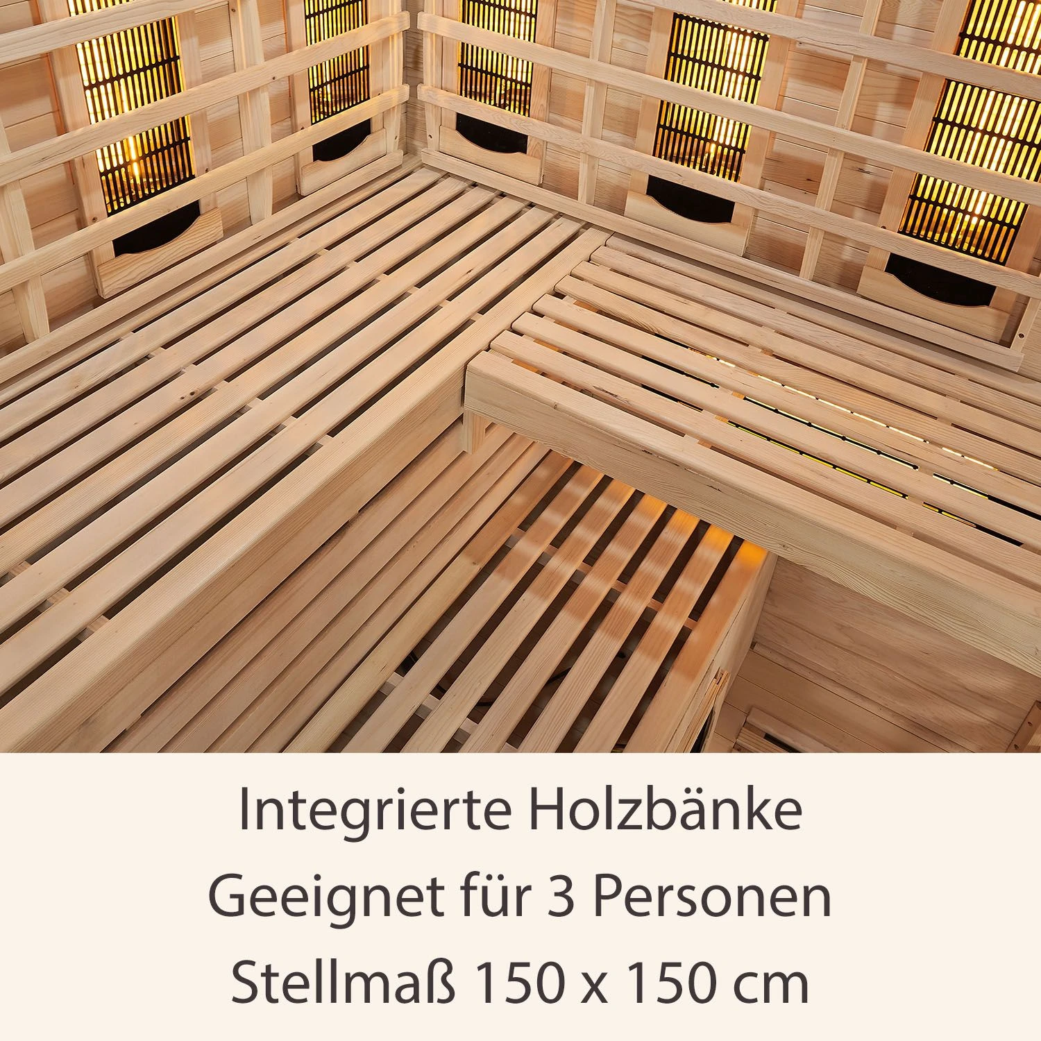 Die großen integrierten Holzbänke bieten für bis zu 3 Personen einen bequemen Sitzplatz. Mit einem Stellmaß von 150 x 150 cm bleibt die Infrarotkabine eine platzsparende Angelegenheit. Schaffen auch Sie sich Ihre eigene kleine Wellness-Oase für Zuhause.