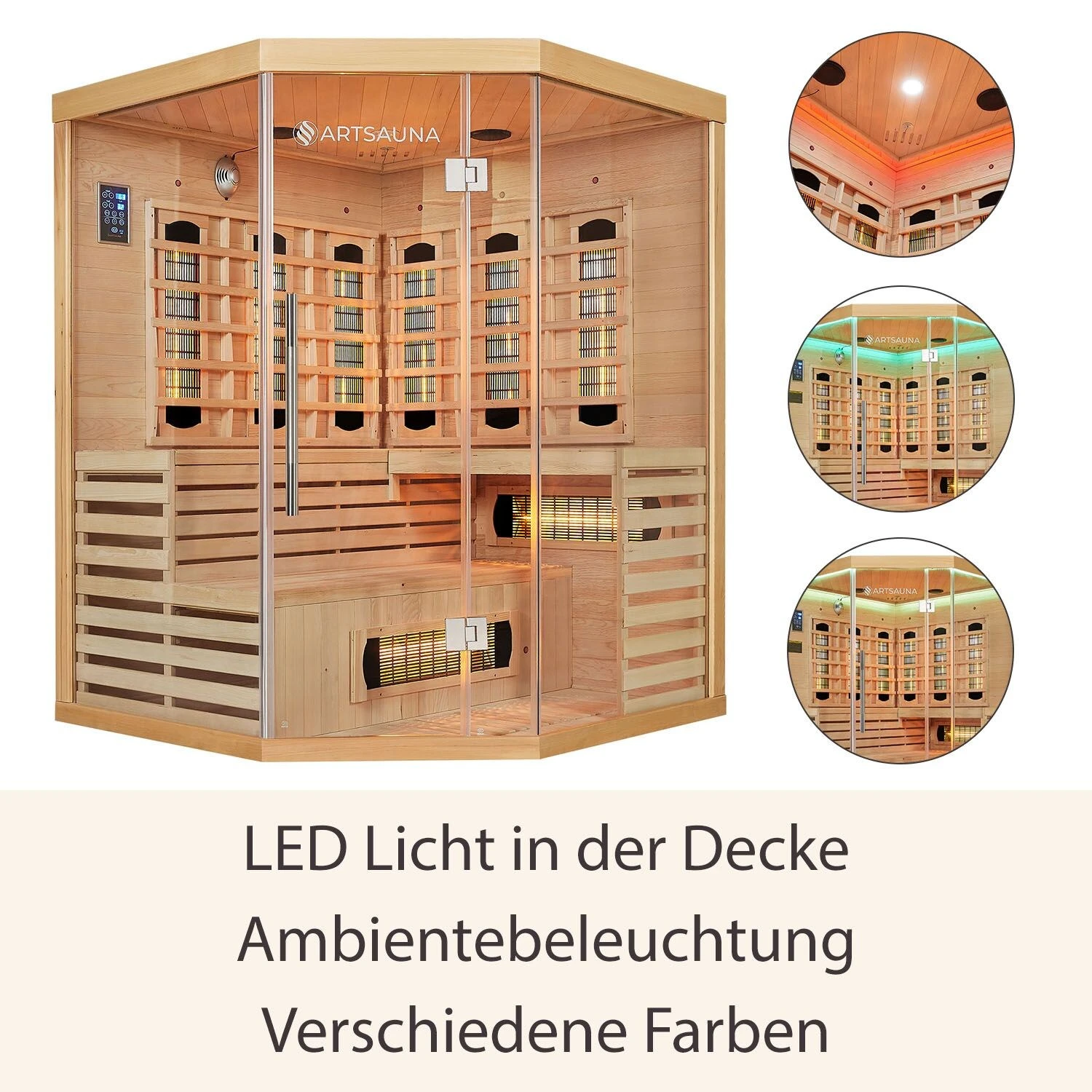 Ein besonderes Highlight ist das LED-Licht, welches die Decke der Kabine komplett umrandet. Die stimmungsvolle Ambientebeleuchtung wirft ein indirektes Farblicht in die Wärmekabine und schafft so die perfekte Atmosphäre zum Wohlfühlen. Die einzelnen Farben können Sie nach Belieben steuern. Ein zusätzlicher LED Spot sorgt für Helligkeit.