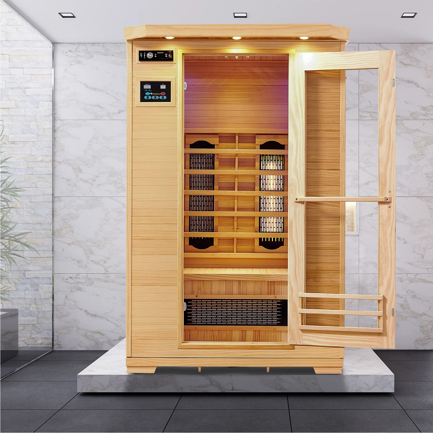 Die Infrarotsauna ist mit einem modernen HIFI-System ausgestattet. Lehnen Sie sich zurück und lauschen den Klängen Ihrer Lieblingsmusik. Das Radio verfügt über ein FM-Radio, einem AUX-Anschluss und Anschlüsse für USB-Speichermedien und SD-Karten.