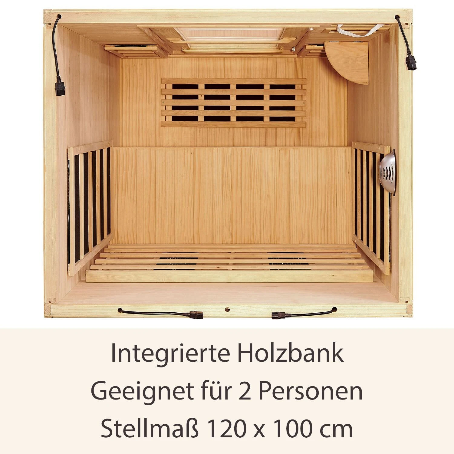 Auf der großen integrierten Sitzbank finden 2 Personen bequem Platz. Mit einem Stellmaß von 120 x 100 cm bleibt die Infrarotkabine eine platzsparende Angelegenheit. Schaffen auch Sie sich Ihre eigene kleine Wellness-Oase für Zuhause.