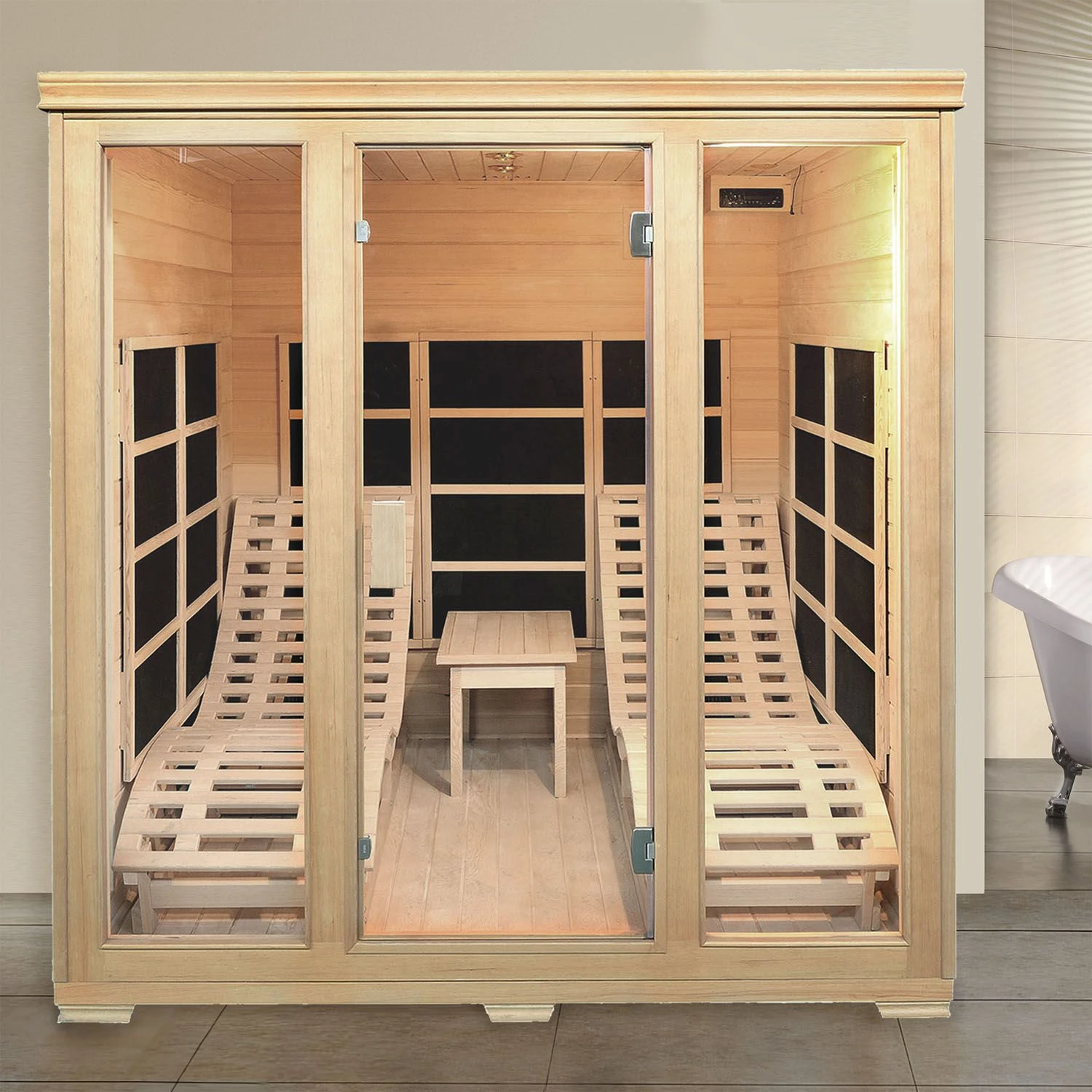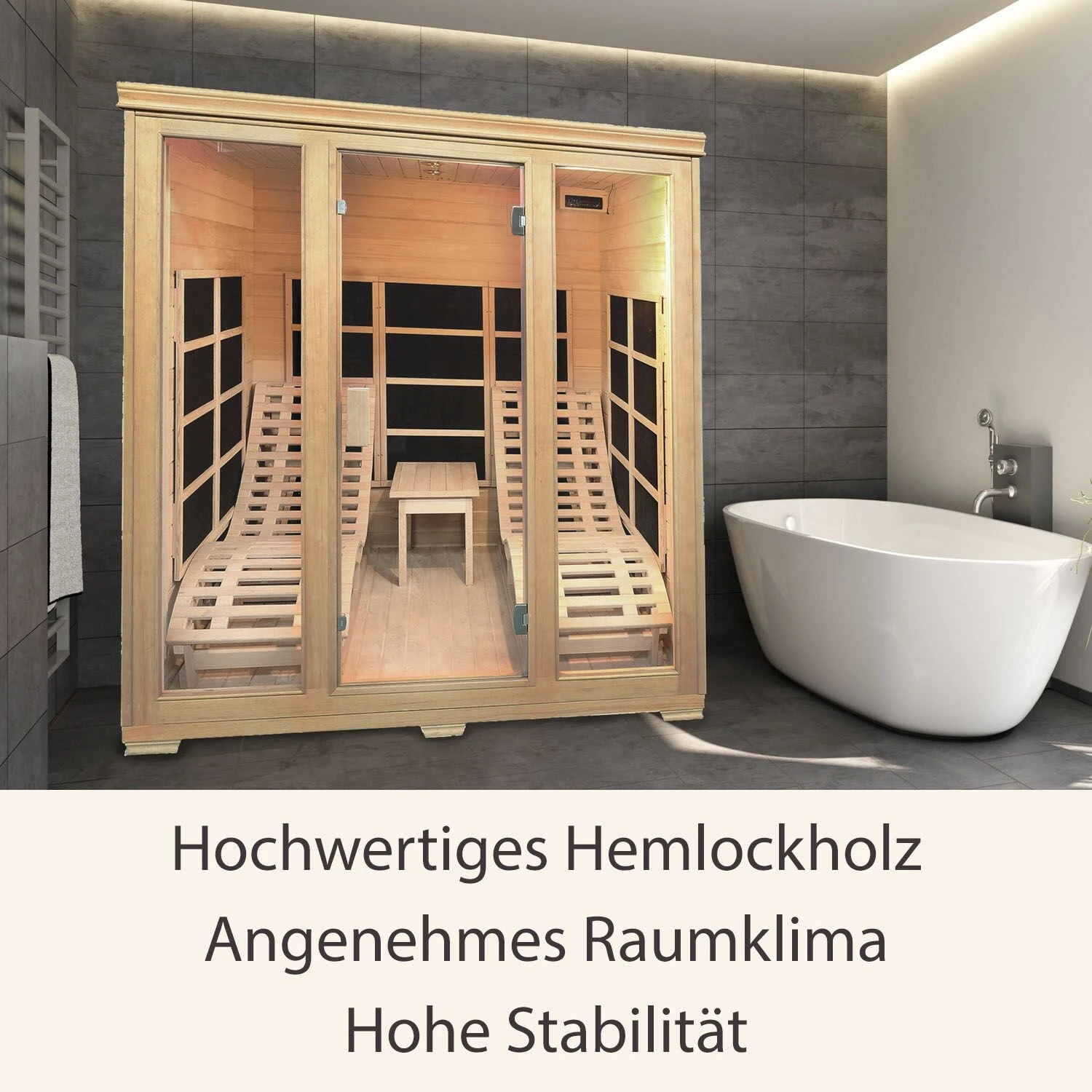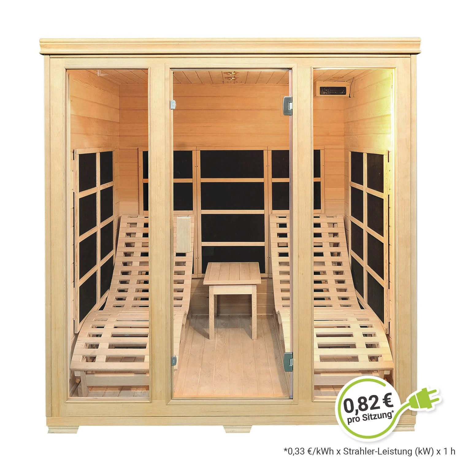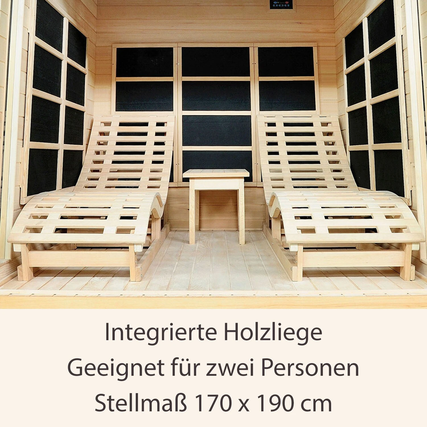 Auf den beiden großen komfortablen Liegen finden 2 Personen bequem Platz. Mit einem Stellmaß von 170 x 190 cm bleibt die Infrarotkabine eine platzsparende Angelegenheit. Schaffen auch Sie sich Ihre eigene kleine Wellness-Oase für Zuhause.