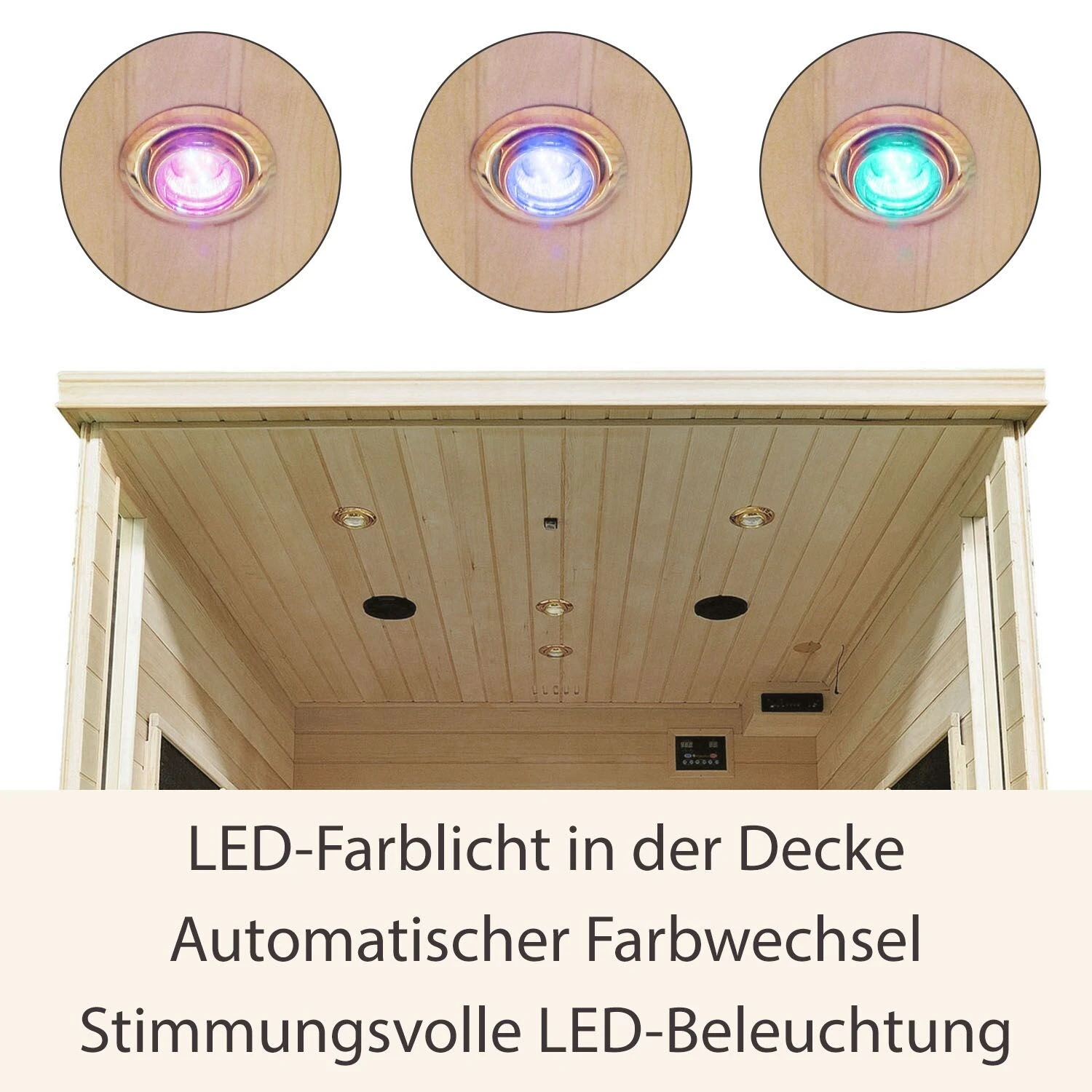 Ein besonderes Highlight ist das stimmungsvolle LED-Farblicht in der Decke. Die bunten Lichter wechseln automatisch zwischen verschiedenen Farben und schaffen so die perfekte Wohlfühlatmosphäre.