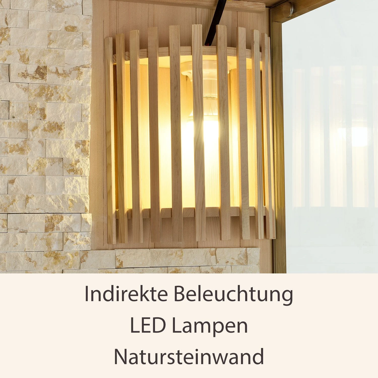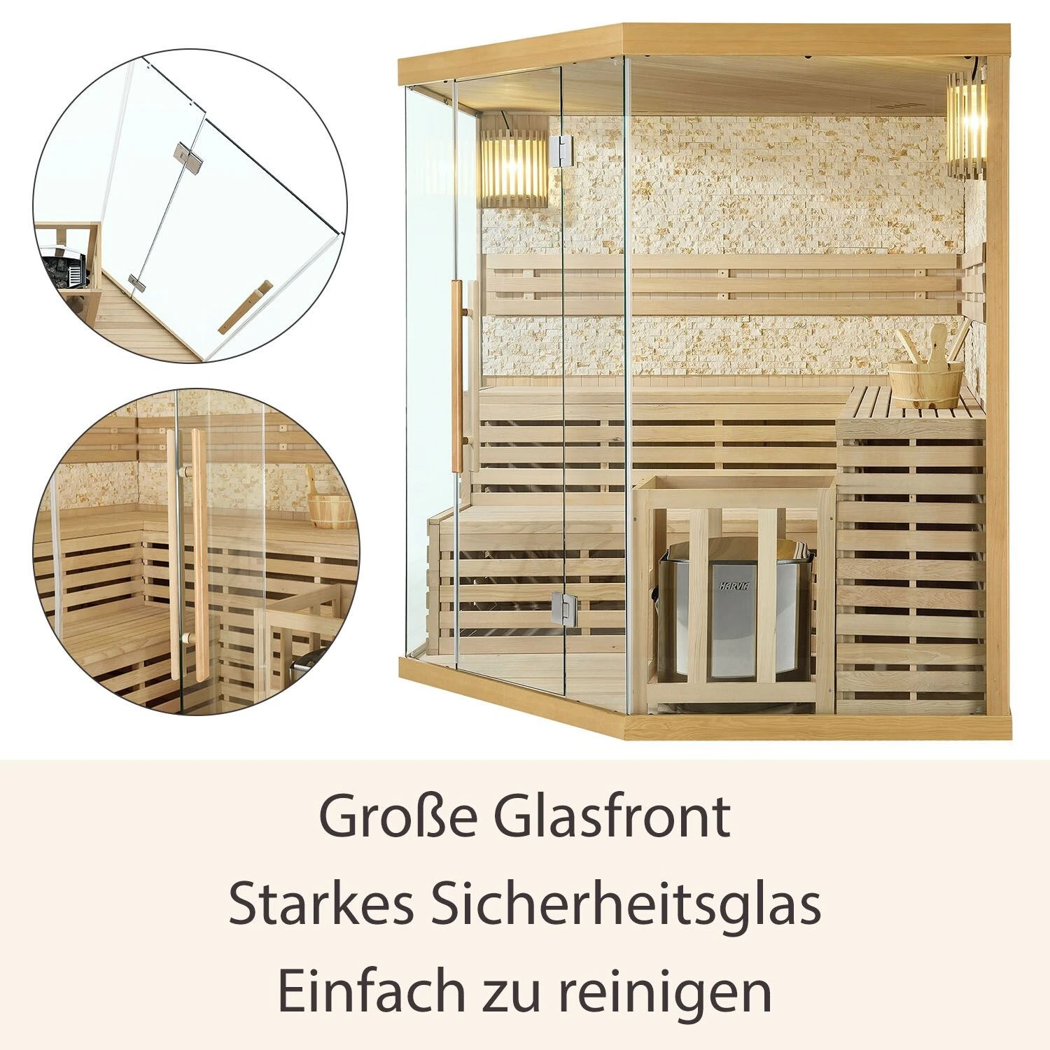 Mit der Eck-Saunakabine Espoo200 Premium mit Naturstein-Wand bringen Sie die gesunde Wirkung eines Saunagangs direkt nach Hause. So können Sie immer nach Lust und Laune saunieren und sich entspannt gesund schwitzen. Die moderne 5 Personen Kabine mit großer, eckiger Glasfront wird als Komplett-Set inklusive Saunasteinen, Kelle und Aufgusseimer geliefert. So können Sie mit der Wellnessbehandlung sofort starten. Für zusätzlichen Komfort sorgen extra Gadgets wie ein Thermometer und eine Sanduhr. Machen Sie Urlaub vom Alltag und bringen Sie mit der Massivholzsauna eine Wohlfühl-Oase in die eigenen vier Wände.