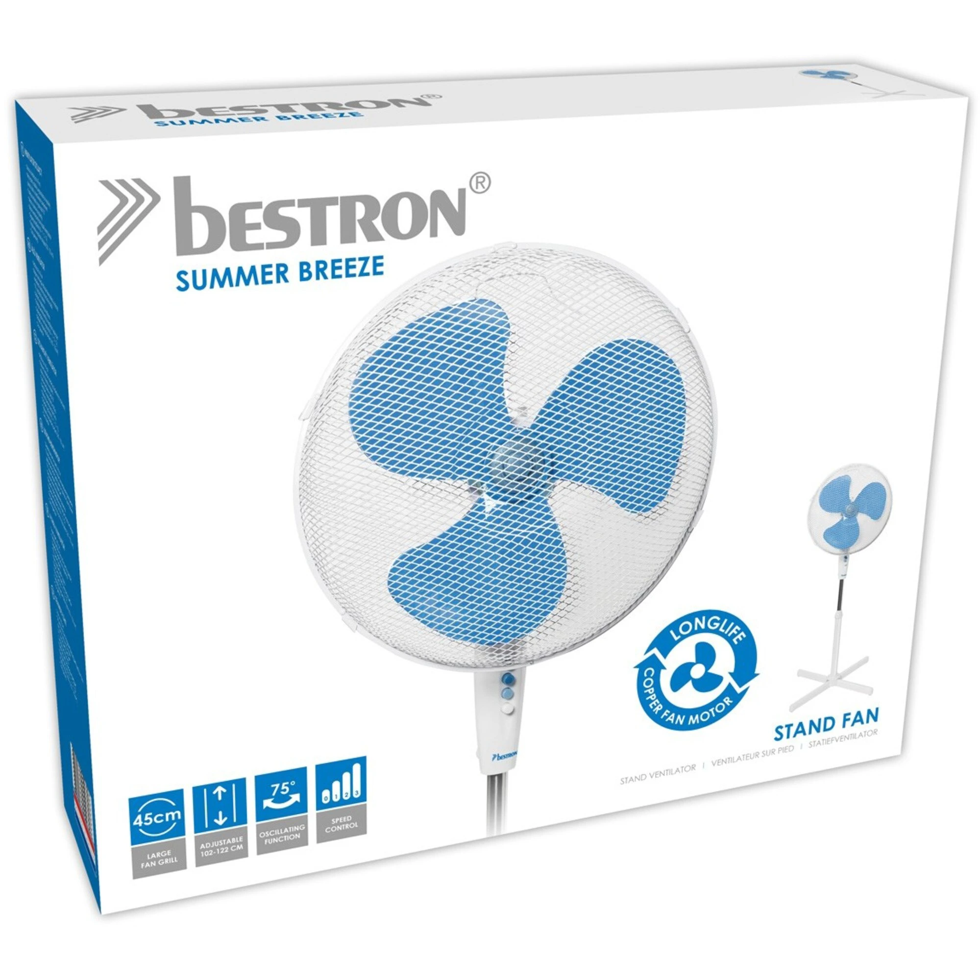 Der Standventilator ASV45W von Bestron ist mit einem hochwertigen, langlebigen Kupfer Motor ausgestattet. Seine 3 Rotorblätter sorgen hinter einem Schutzgitter für optimale und geräuscharme Luftzirkulation. 3 verschiedene Geschwindigkeitsstufen lassen sich per Knopfdruck regeln und sorgen für einen optimalen Luftstrom. Der ASV45W lässt sich von 107 cm bis auf 129 cm verstellen und hat einen verstellbar Neigungswinkel sowie einen Schwenkfunktion von 75°.