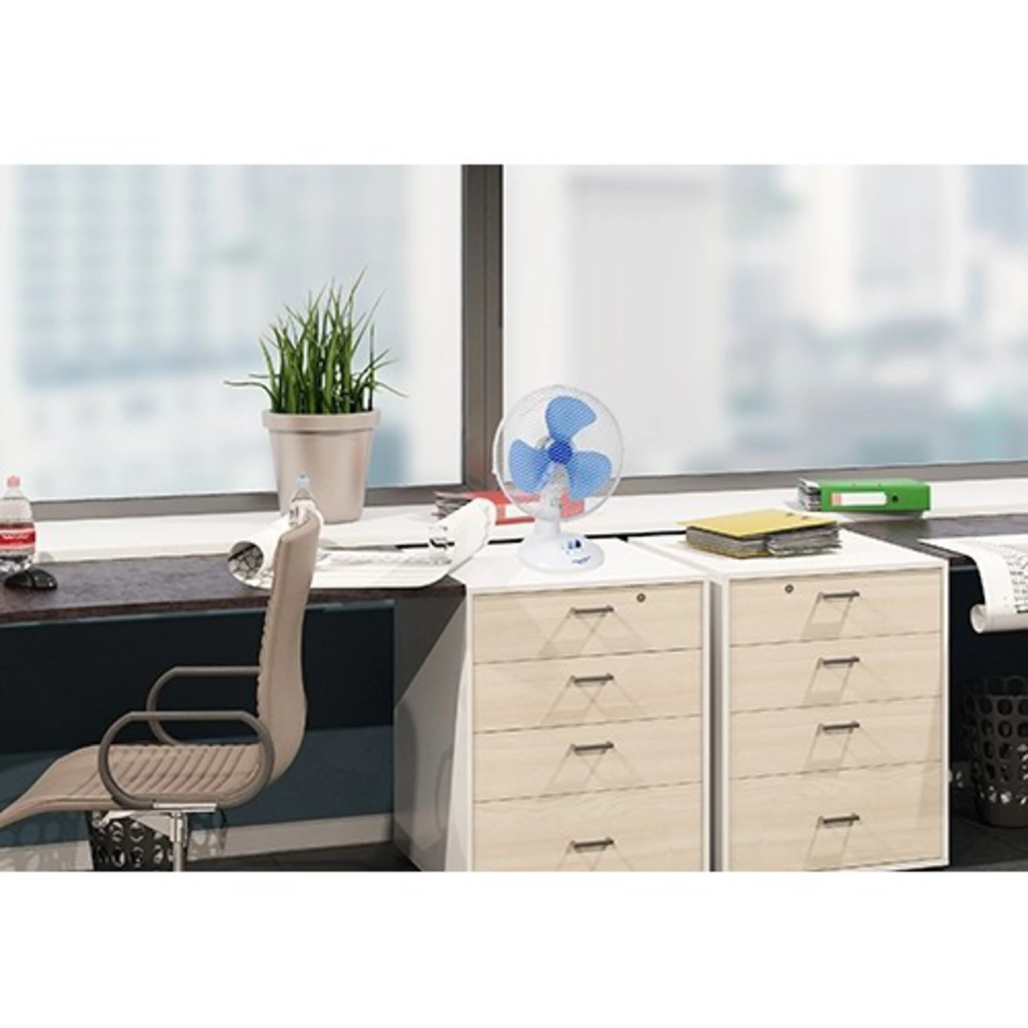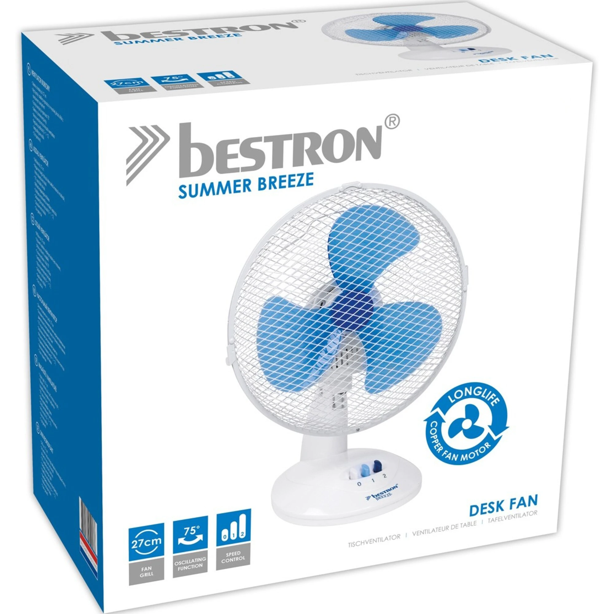 Der Tischventilator DDF27W von Bestron ist mit einem hochwertigen, langlebigen Motor ausgestattet. Seine 3 ärodynamische Lüfterflügel sorgen hinter einem Schutzgitter für optimale und geräuscharme Luftzirkulation. 2 verschiedene Geschwindigkeitsstufen lassen sich per Tastendruck regeln und sorgen für einen optimalen Luftstrom. Der DDF27W hat eine Schwenkfunktion von 75°. Zur sicherer Standfestigkeit dienen die angebrachten Antirutschfüße.