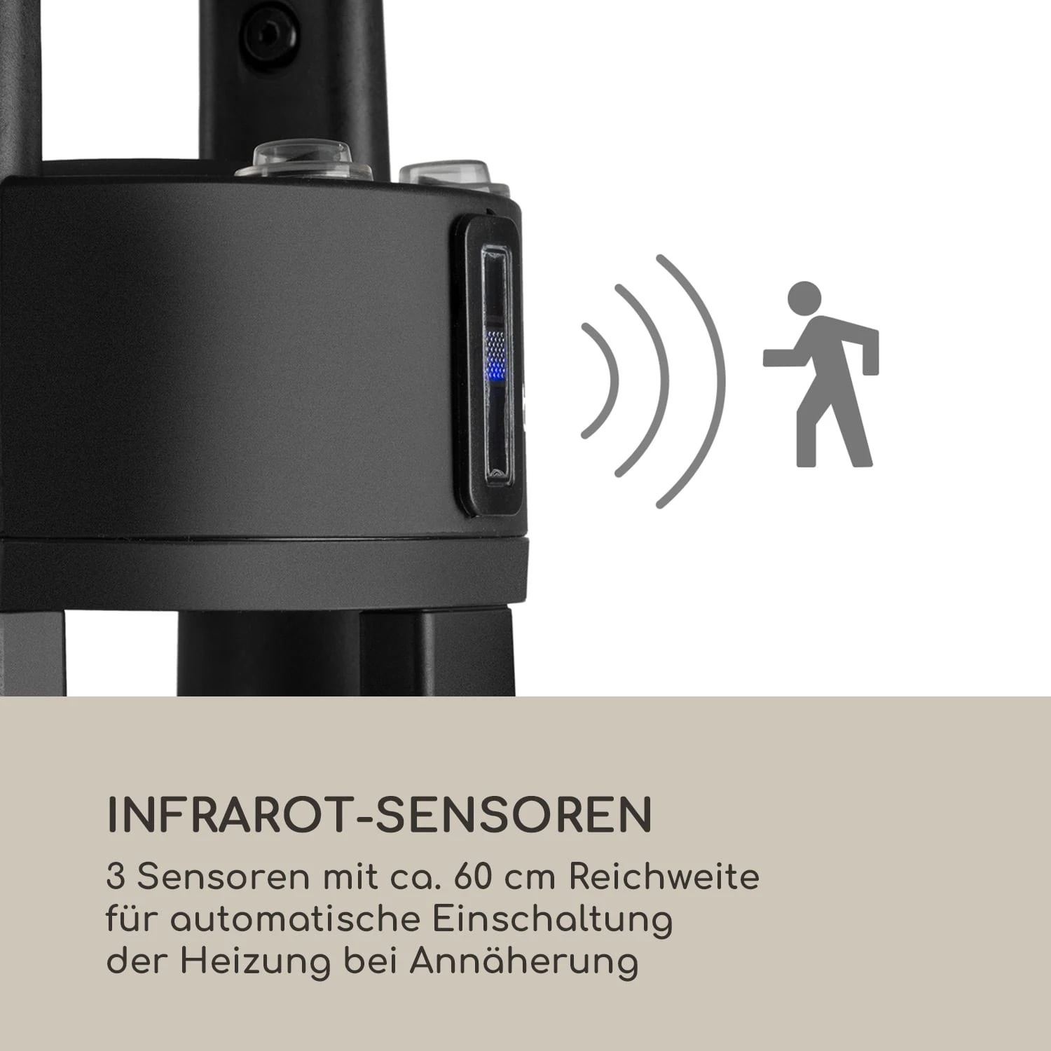 - Infrarot-Sensoren: 3 Sensoren mit ca. 60 cm Reichweite für automatische Einschaltung der Heizung bei Annäherung