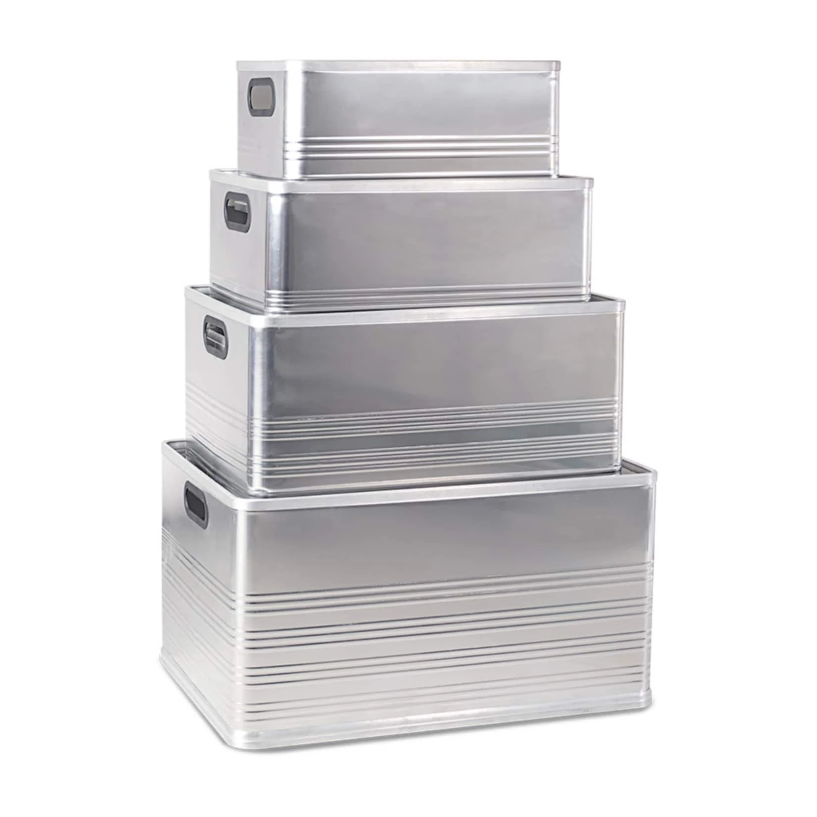 Das Set enthält: 1x 29 Liter, 1x 50 Liter, 1x 79 Liter und 1x 118 Liter Aluminium-Kasten. Die Kästen sind größenmäßig stapelbar.
