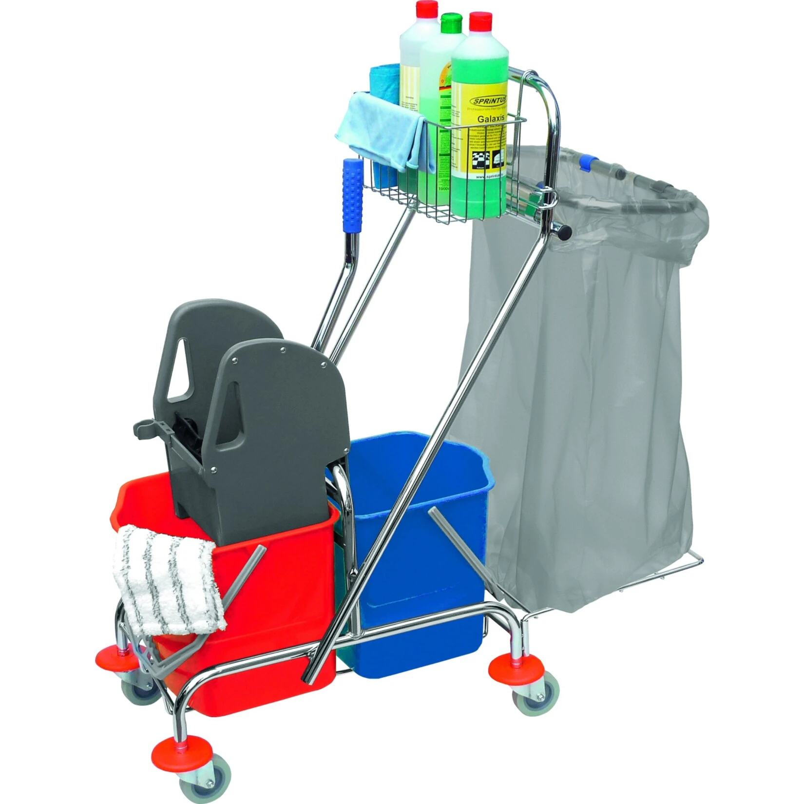 Der BRB-Lagertechnik Putzwagen ist ausgestattet mit Ablagekorb, Schiebebügel und Halterung für Abfallsäcke.