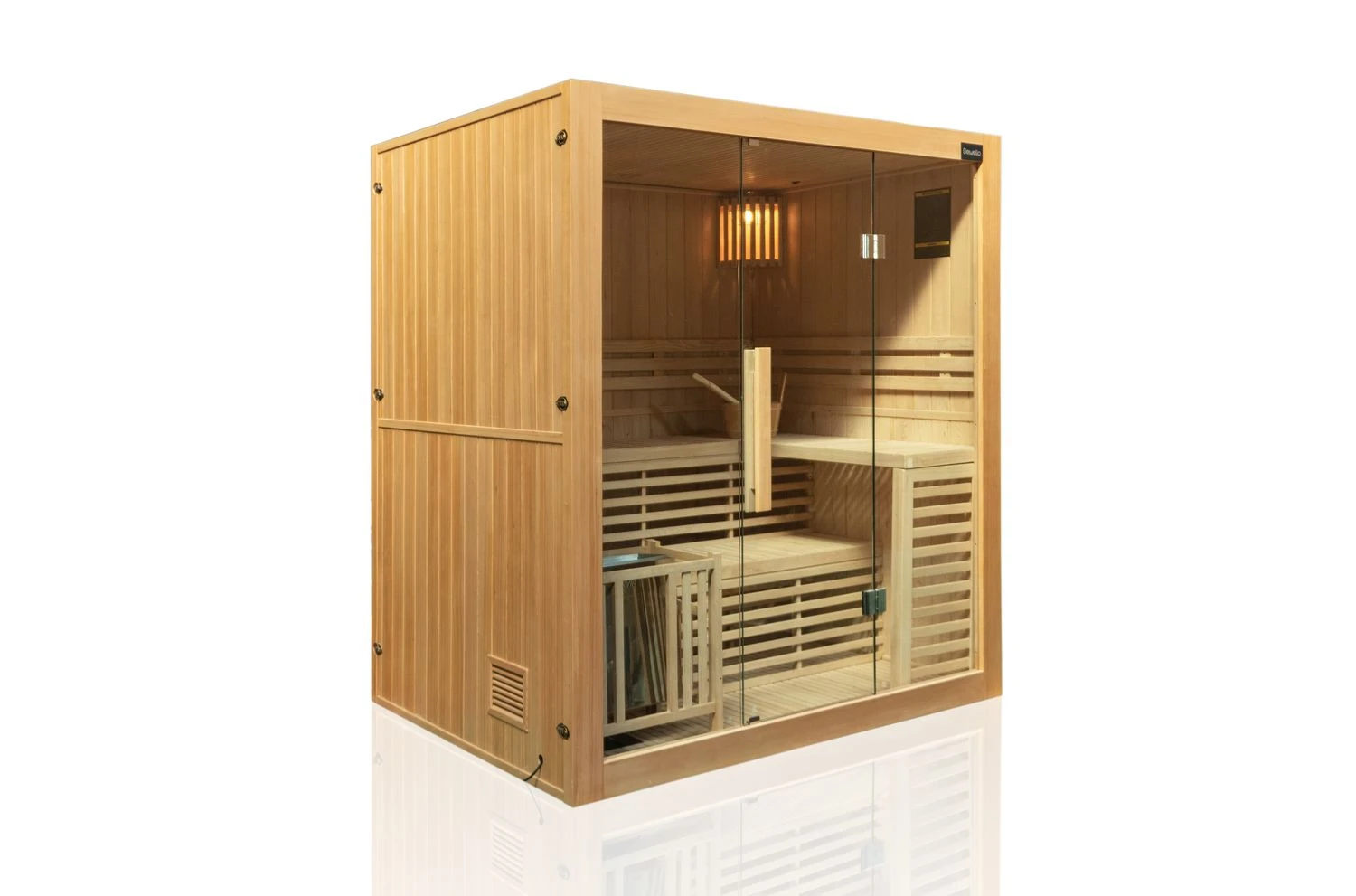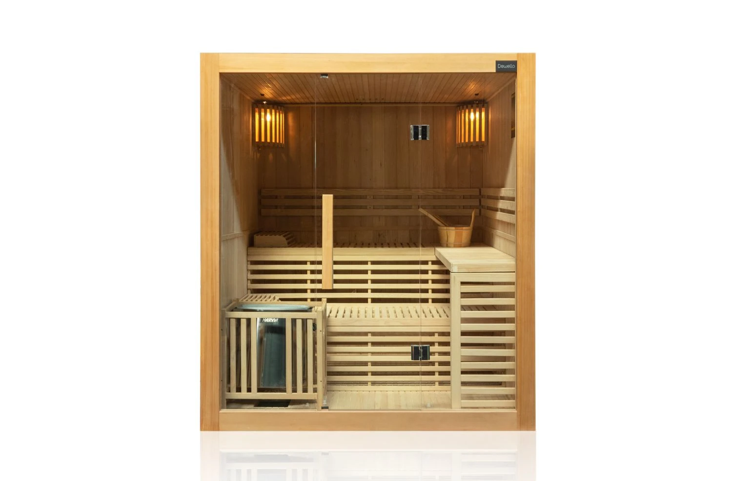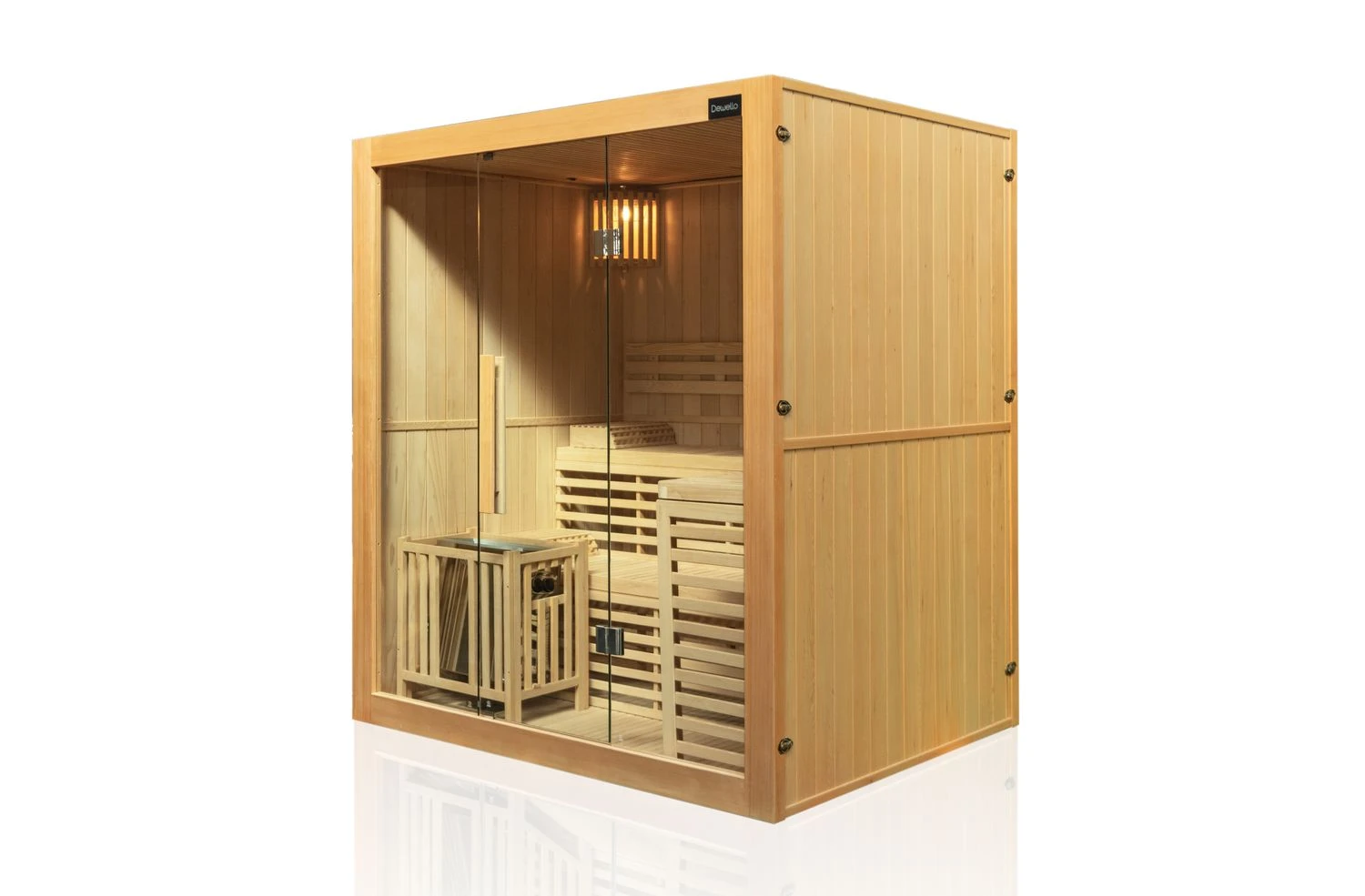 Die Dewello Sauna “SARNIA” für die ganze Familie! Hergestellt aus hochwertigem Hemlock Tannenholz.