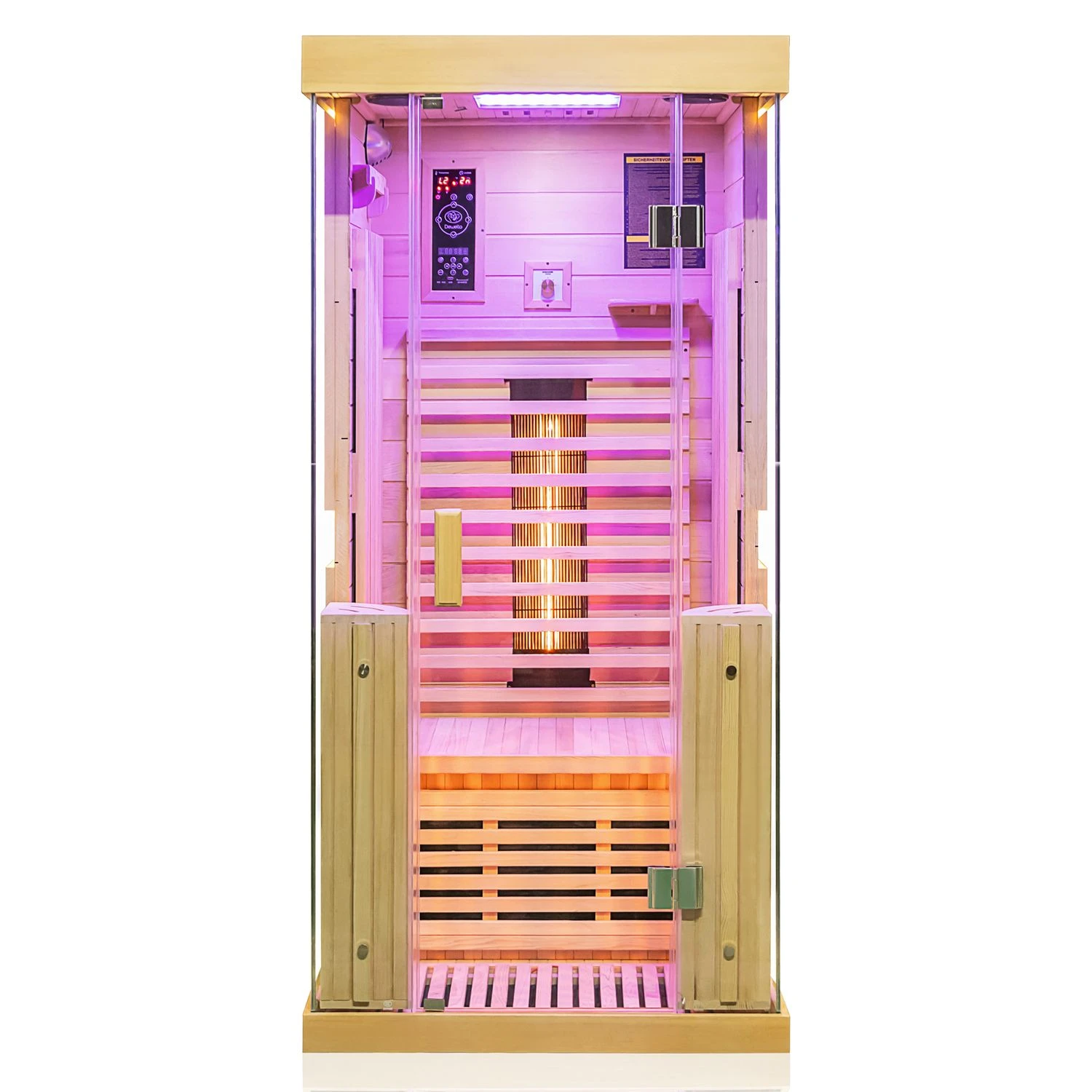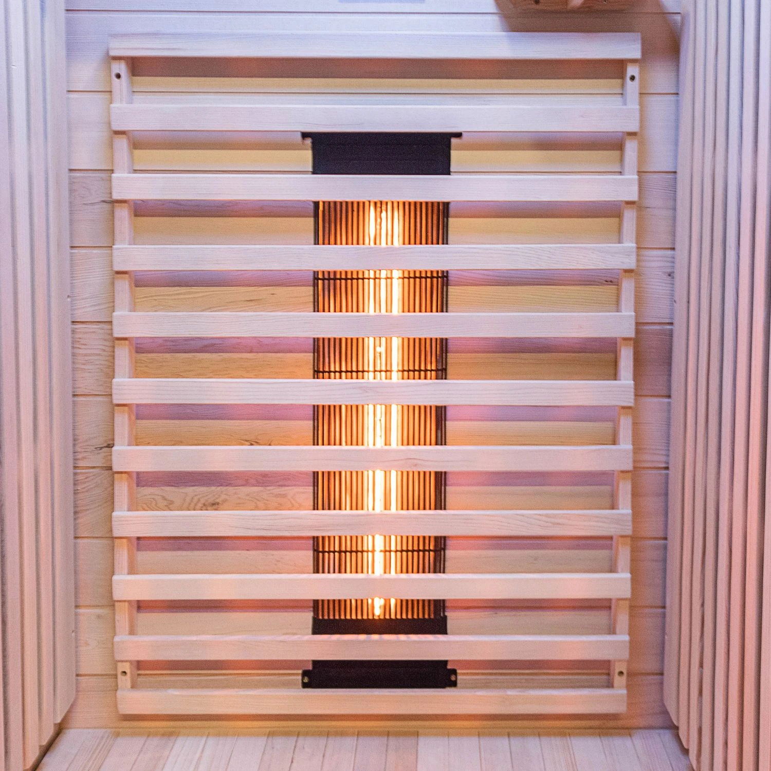 Der Vollspektrumstrahler im Rückenbereich lässt sich einzeln abschalten und regulieren. Daher ist die Kabine auch für Personen geeignet, welche die Wärme an bestimmten Bereichen nicht so gut vertragen.