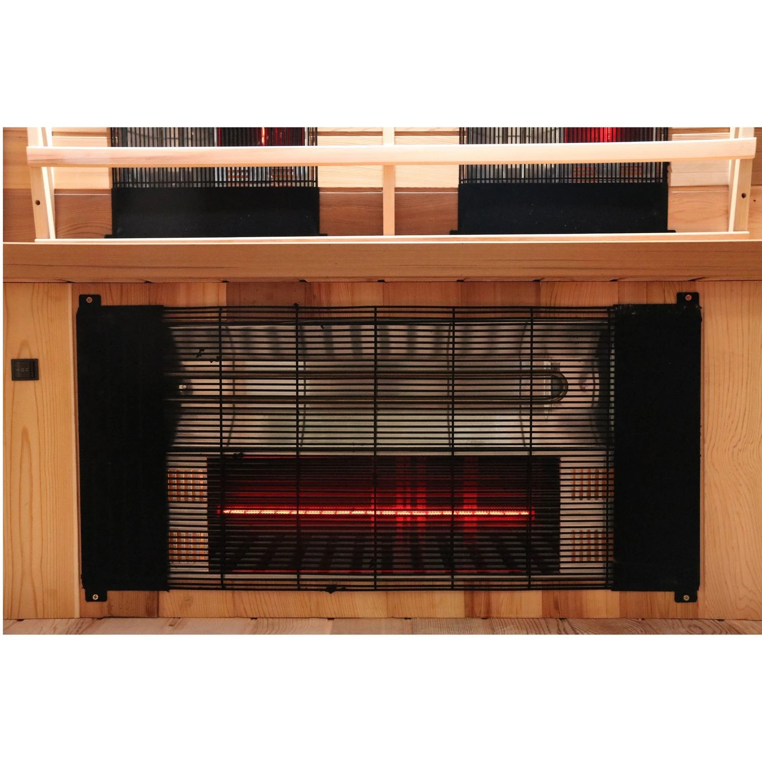 Die Glastür ist aus Sicherheitsglas gefertigt und die Scharniere sind aus Edelstahl! Da der Türgriff aus Holz gefertigt ist, heizt sich dieser bei hoher Temperatur im Innenraum nicht so stark auf, dass Sie sich verbrennen.Die Kabine wird steckfertig geliefert und Sie müssen nur noch die Wände & Stecker miteinander verbinden (Klick- System). Die Strahler und die Steuereinheit sind bereits in den Wänden verbaut. Strahler & Temperatur:Dank den gleichmäßig positionierten DUO- Strahlern, kann die Infrarotkabine sich innerhalb weniger Minuten auf die von Ihnen eingestellte Temperatur aufheizen.