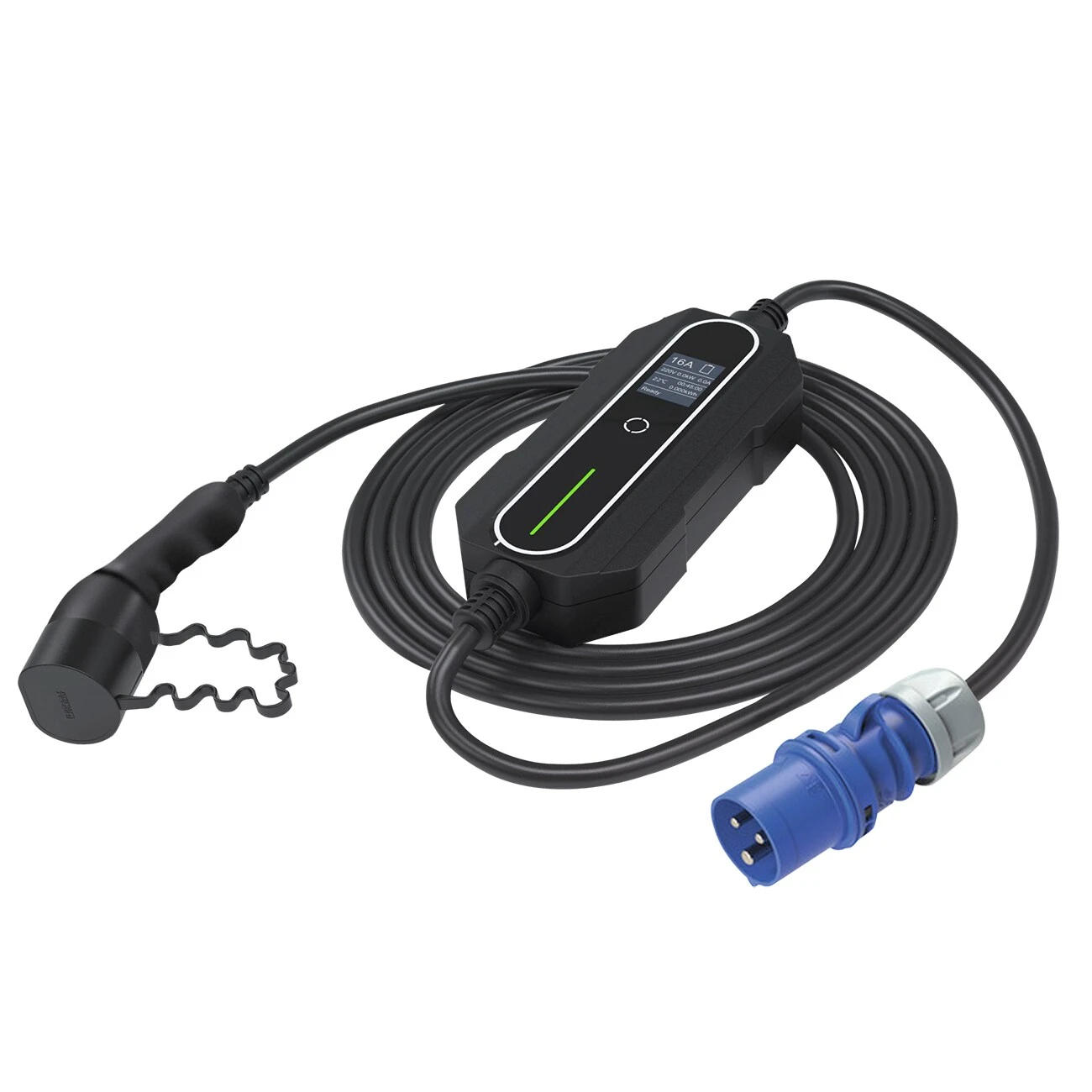 Die sehr kompakte, mobileEV-Ladeeinheit gibt Ihnen die Freiheit Ihr Fahrzeug an nahezu jederbeliebigen Steckdose sicher aufzuladen. Einfach den CEE Stecker der Ladeeinheit an einer geeigneten Steckdose einstecken,den Type 2 Stecker der Einheit mit Ihrem Elektro Fahrzeugverbinden, und schon wird das Fahrzeug mit satten 3600 WattLeistung aufgeladen. Der Ausgangsstrom ist von 6 bis 16Aeinstellbar. Das eingebaute OLED Display informiert Siewährend des Ladevorganges über den aktuellen Ladezustand, Ladespannung, Strom undTemperatur. Ebenso wird der kumulierte Leistungsverbrauch ermittelt und der Gesamtwert angezeigt. Die Fehlerstromüberwachung erkennt Unregelmäßigkeitenund schaltet die Ladeeinheit bei Fehlfunktion ab. So ist Ihr Fahrzeug während des Ladevorgangs bestens geschützt. Das mobileLadegerät ist mit blauemCEE-Stecker ausgestattet . Die für den Lader konzipierte Tragetasche lässt sich bequemim Fahrzeug verstauen und bietet besten Schutz gegen Verschmutzung und Beschädigung.