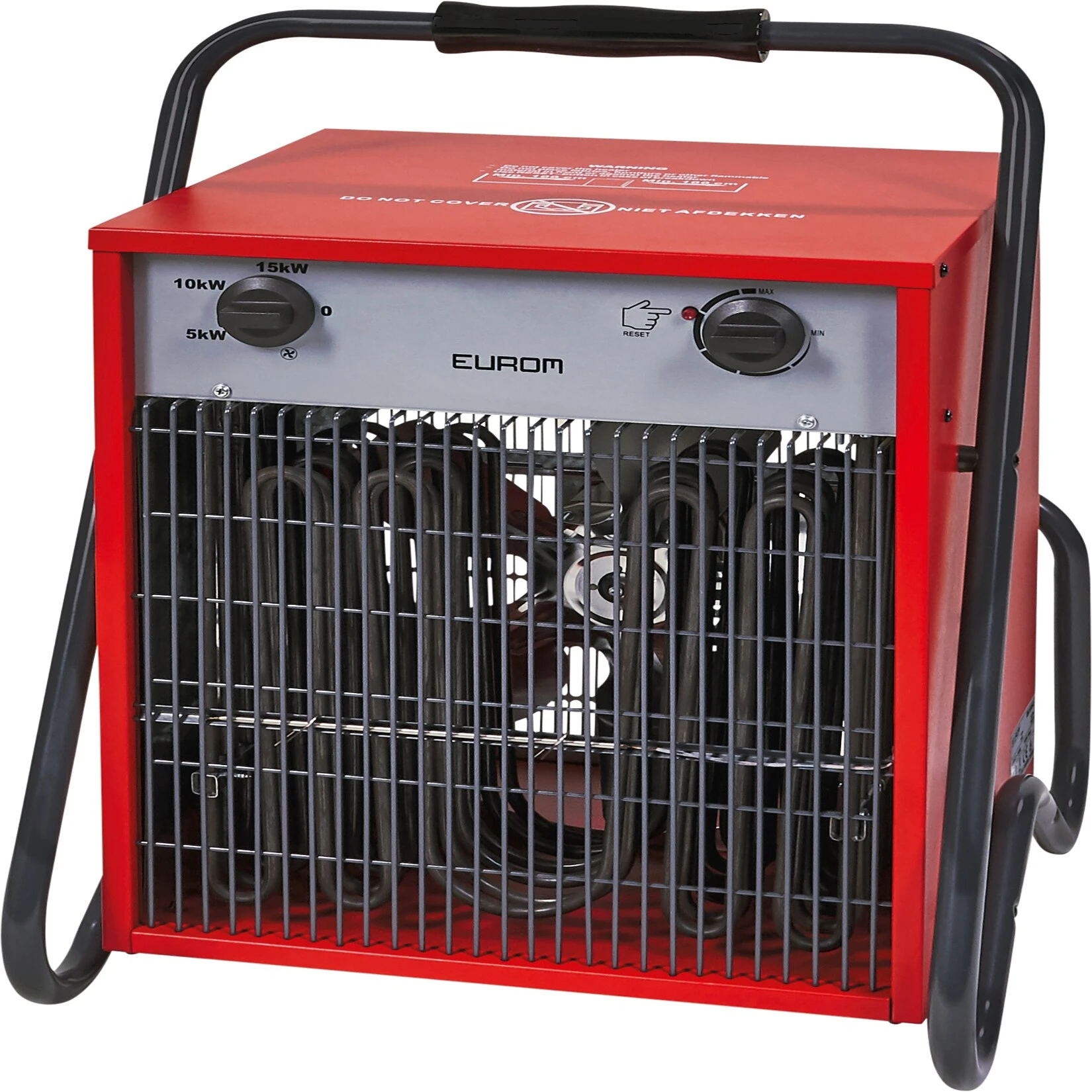 Der Eurom EK15002 ist ein Heizlüfter mit Strom (400 V) für den Einsatz in Garagen, Schuppen und Werkstätten.