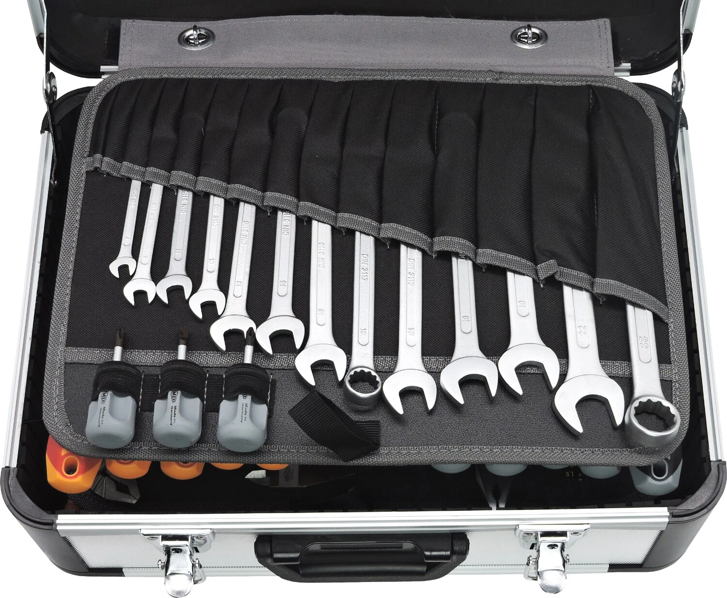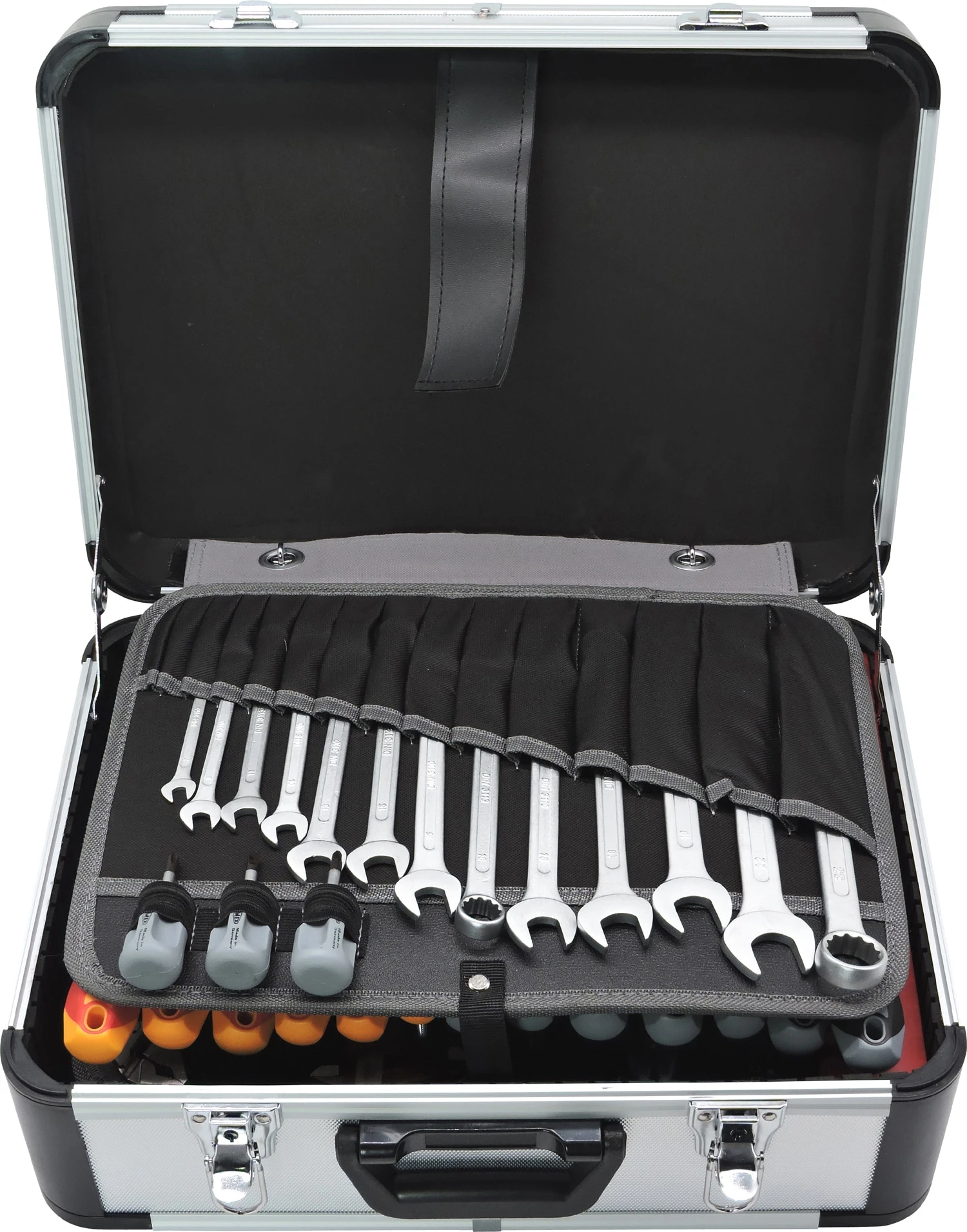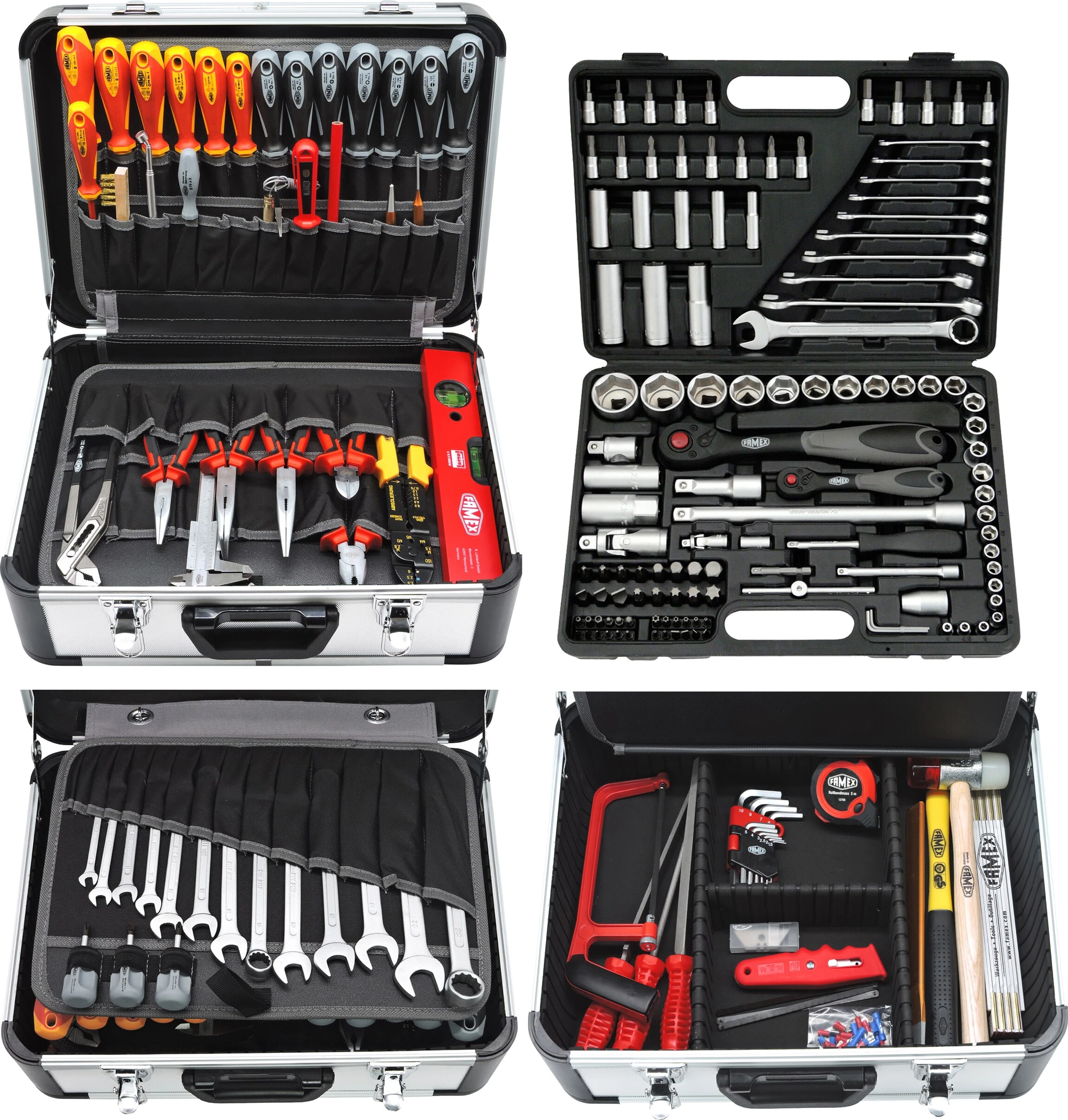 Das Komplett Set deckt alle gängigen Arbeiten ab und ist zudem für den gewerblichen Einsatz ausgelegt. Einige der Werkzeuge, wie zum Beispiel die Wasserpumpenzange oder alle Schraubendreher, werden in Deutschland hergestellt. Der Werkzeugkoffer verfügt über besonders stabile Scharniere und Verschlüsse. Die Außenflächen sind aus Aluminium (kein alu-gefärbter Kunststoff!). Zudem ist der Werkzeugkoffer aus hochwertigen Materialien gewichtsoptimiert und elastisch aufgebaut. Dadurch ist der Werkzeugkoffer bei geringem Gewicht äußerst hoch belastbar! Alle Werkzeuge verfügen über eine sehr hohe Qualität. Diese Werkzeuge sind für den gewerblichen Dauereinsatz ausgelegt. Die Schraubenschlüssel sind aus Chrom-Vanadium Stahl geschmiedet, die Spitzen der Schraubendreher aus hochwertigem Chrom-Vanadium Molybdän und die Schneiden der Zangen sind zusätzlich induktiv gehärtet.