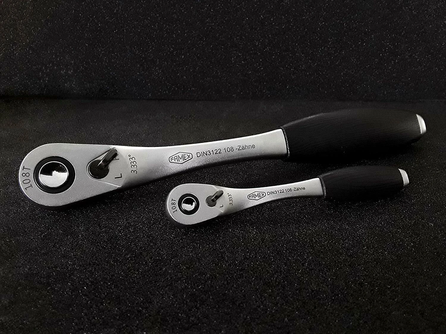- 2 Feinzahn-Umschaltknarren mit 108 Zähnen, mit Mehrfachverzahnung, 1/2″- und 1/4″-Antrieb, Umschalthebel für Einhandbedienung, Verriegelungs-Mechanik und 2-Komponenengriff