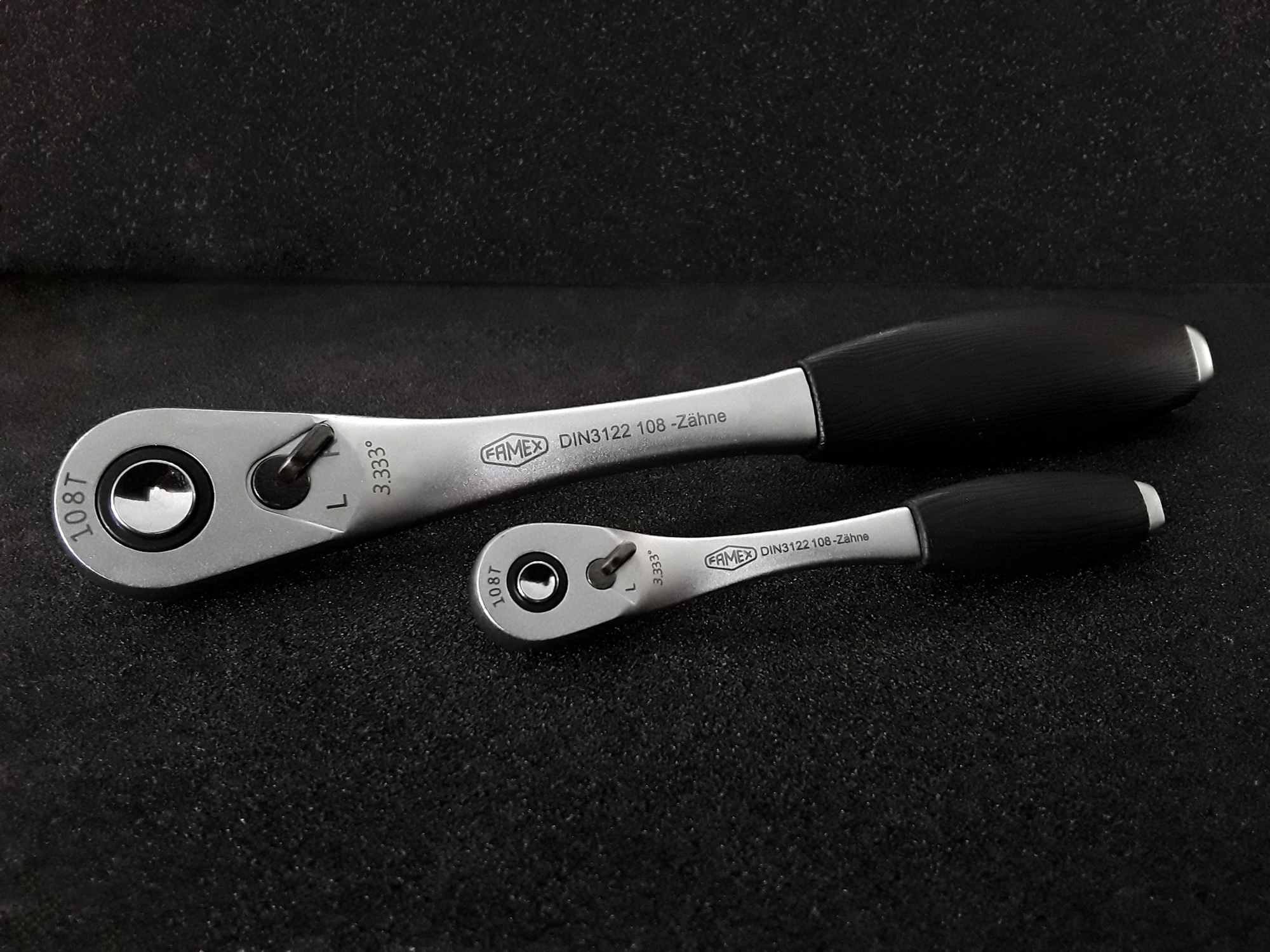 Mit dem FAMEX 580-16 Steckschlüsselsatz erhalten Sie einen besonders hochwertigen und zuverlässigen Profi Steckschlüsselsatz. Der Steckschlüsselsatz verfügt über zwei Super-Feinzahnknarren mit 108 Zähnen, 4 Verlängerungen mit 2-Stufen Wobble-Schwenksystem, 1 Verlängerung mit Verriegelungsmechanik, Steckschlüsseleinsätze mit Wellenprofil und Rändelung und vieles mehr! Die Werkzeuge sind aus besonders hochwertigen Stahl-Legierungen. Die Belastbarkeit übersteigt die DIN-ISO Spezifikationen und eignet sich hervorragend für den gewerblichen Einsatz.