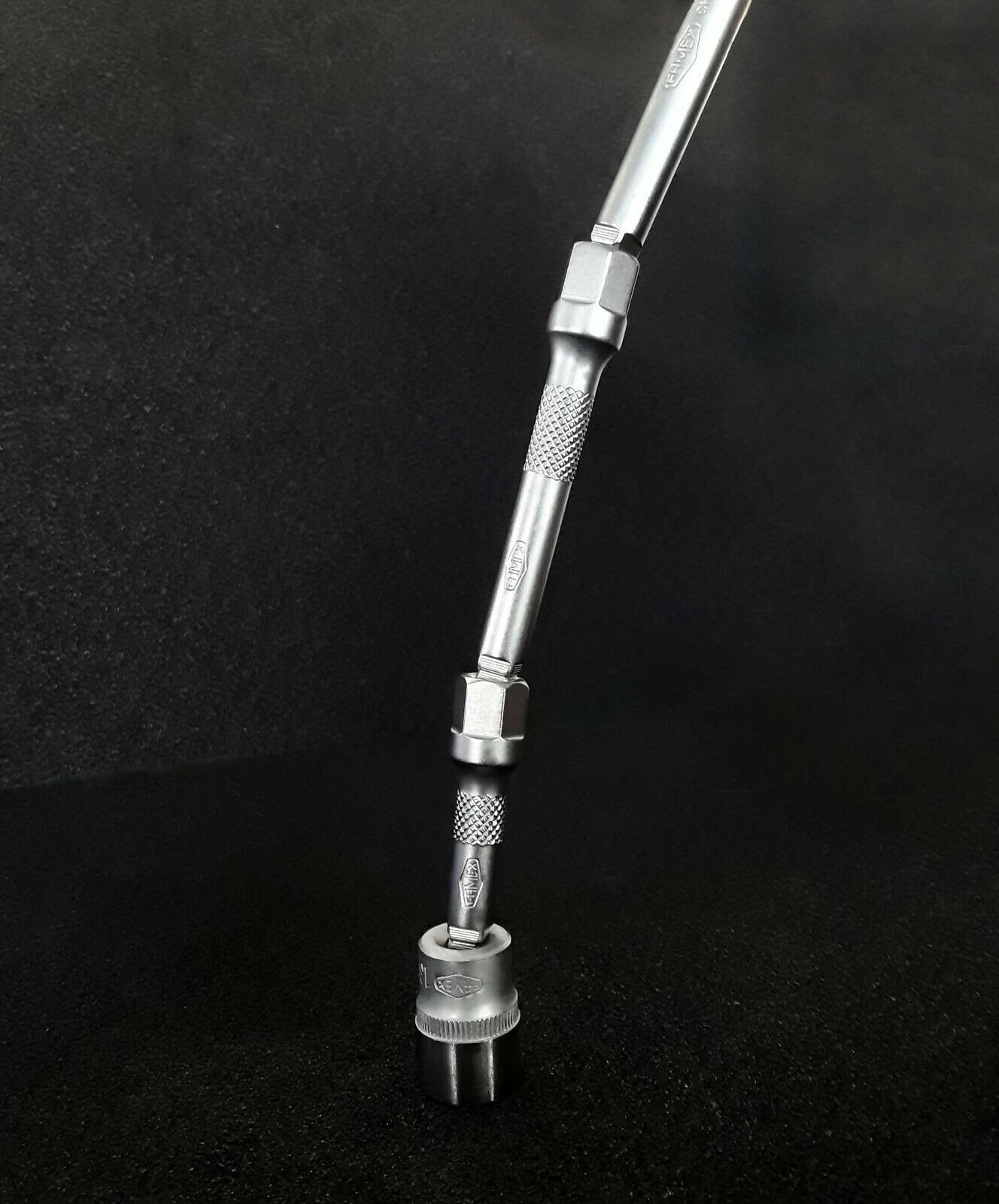 - 3 Spezial-Verlängerungen mit 2-Stufen-Schwenksystem, im 4-kant-Bereich um ca. 10° schwenkbar, 1/4″”-Antrieb