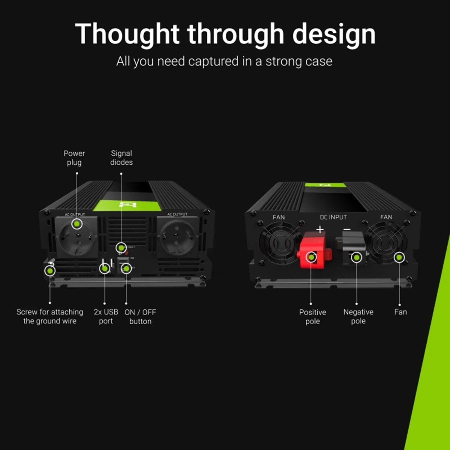 - Der Wechselrichter verfügt über Steckdosen und USB-Anschluss