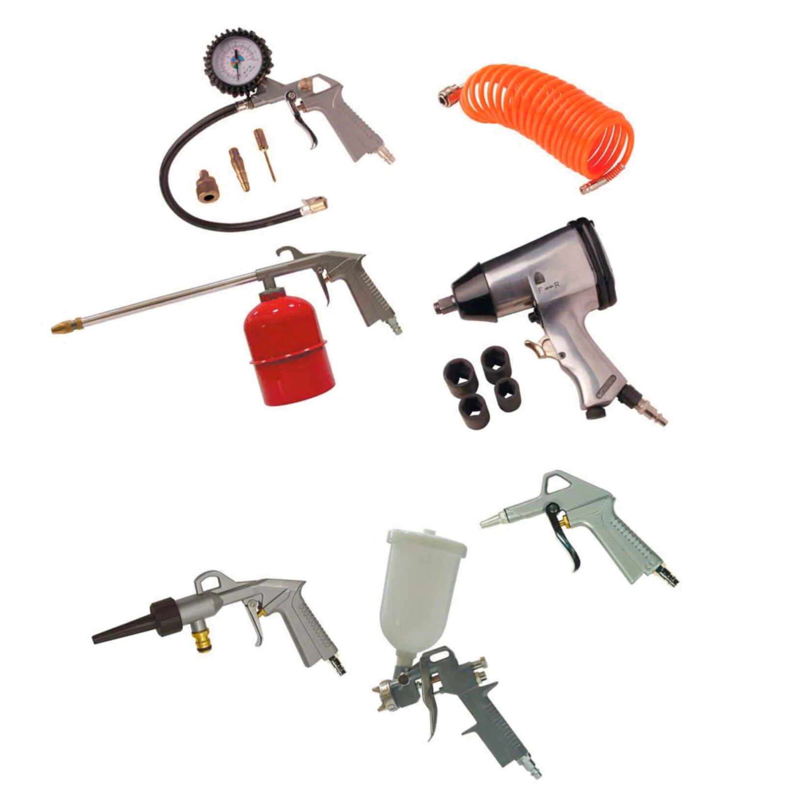 Ein 14-teiliges Zubehör-Set, bestehend aus einem 5 m Spiralschlauch, einer Ausblas-, Farbspritz-, Wasser- und Ölsprühpistole, einem Reifenfüller, einem 3-fachen Adapter-Set zum Auffüllen von Luftmatratzen, Bällen, etc. und einem 5-tlg. Schlagschrauber Set, ist bereits im Lieferumfang enthalten.