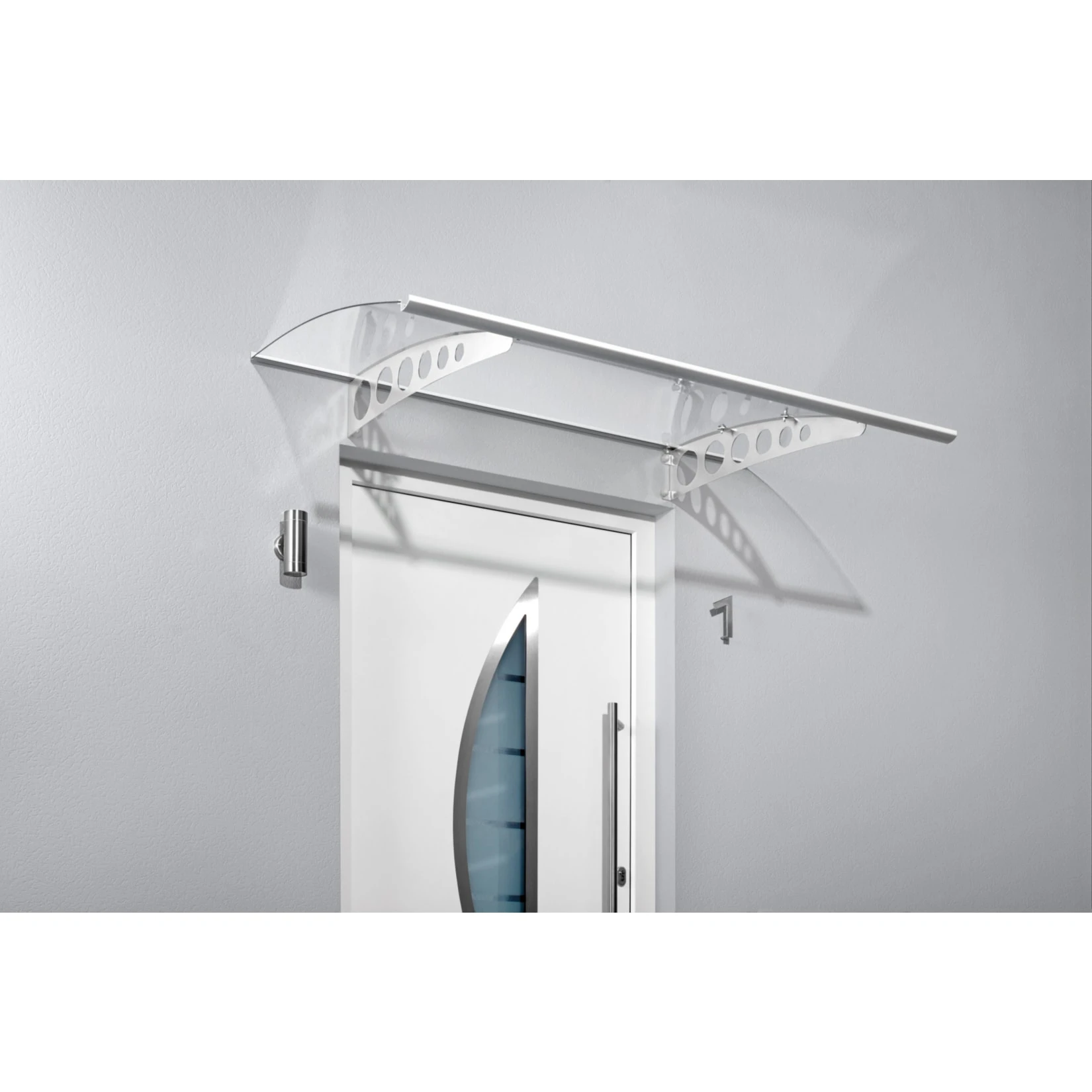 Das Premium-Vordach mit Träger aus Edelstahl, Regenrinne sowie Wandanschluss aus silber eloxiertem Aluminium und einer Abdeckung aus transparentem Acrylsicherheitsglas verleiht jedem Hauseingang durch sein edles Design eine ganz besondere Optik.