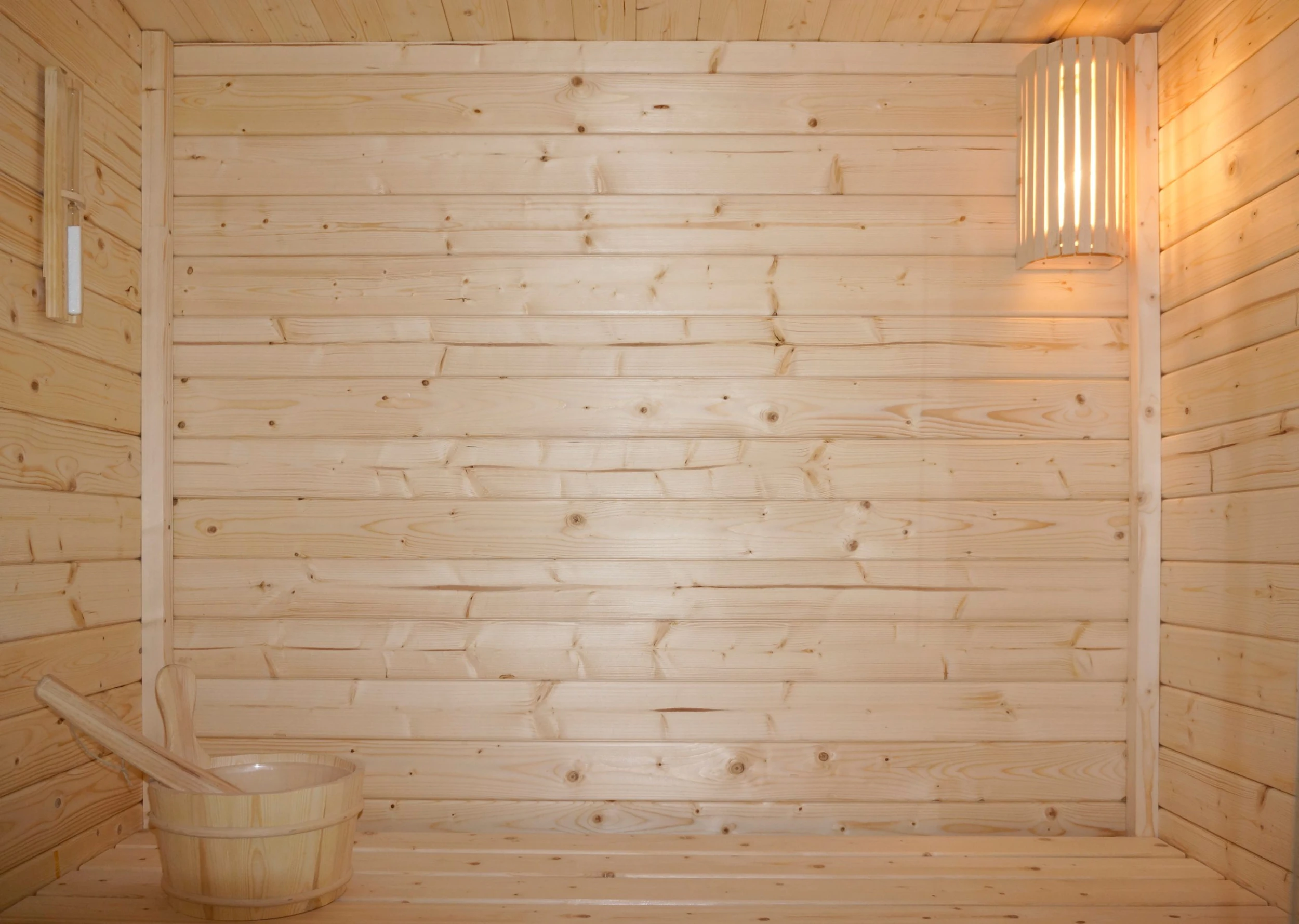 Beim Kauf Deiner TALO M Sauna erhältst Du alles, was Du für einen ordentlichen Saunagang benötigst. Zu dem exklusiven Sauna-Set gehören Kelch, Kelle, Sanduhr, Thermometer und Saunasteine. Für die Beleuchtung sorgt eine Lampe mit angenehmem, warmem Licht. Das Schutzgitter der Lampe verteilt das Licht und sorgt für ein angenehmes Ambiente.