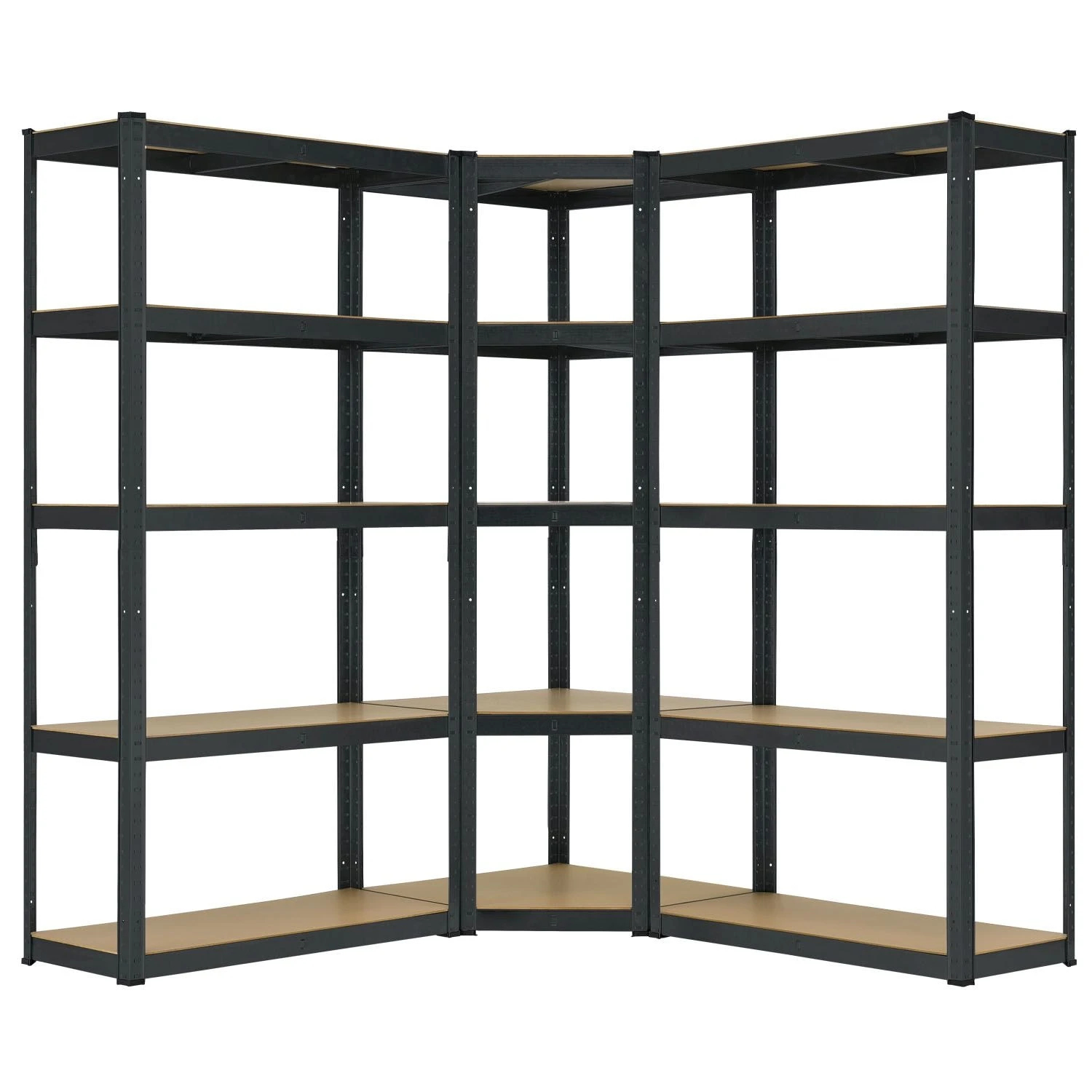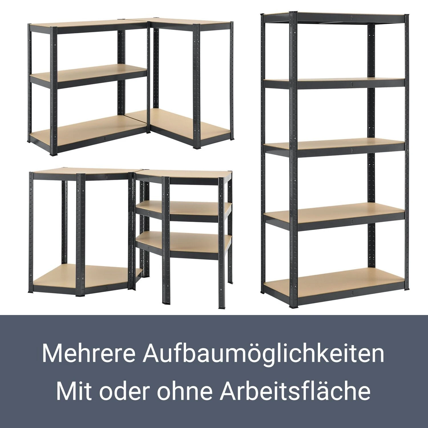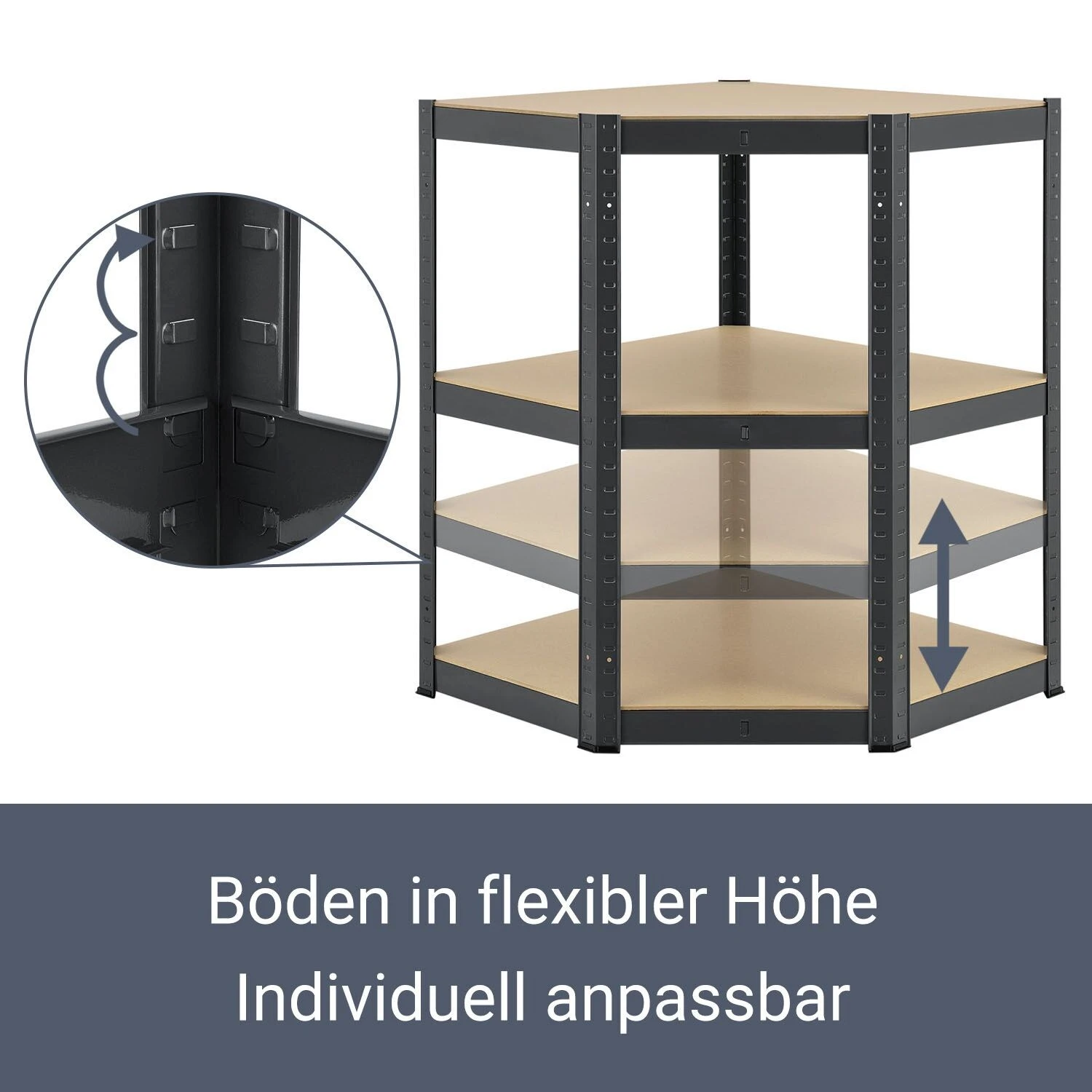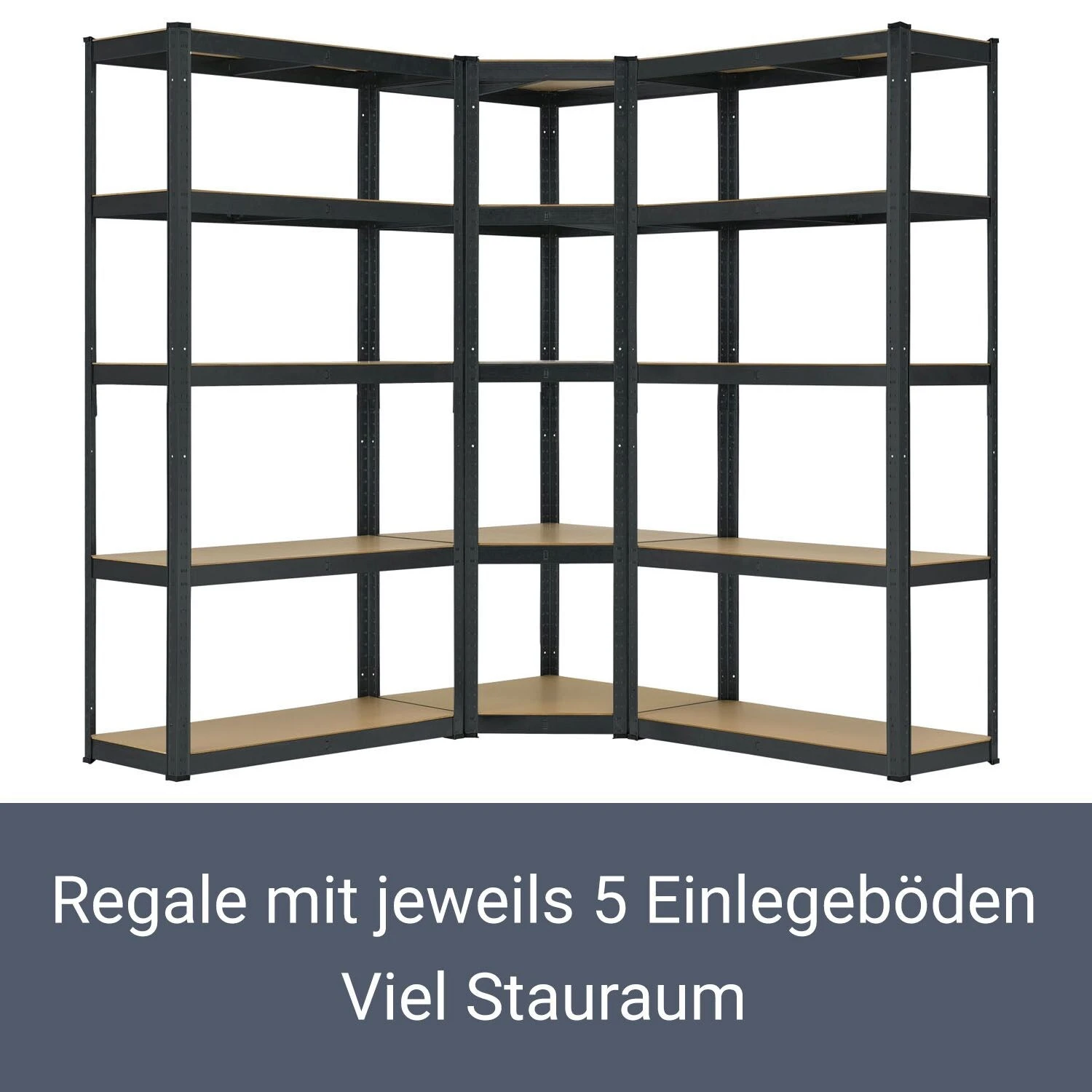 Ob Keller, Garage, Werkstatt oder Abstellkammer – mit dem praktischen 3er Regalsystem Basic bringen Sie Ordnung in Ihr Leben. Das Set besteht aus einem 180 × 70 × 40-70 cm großen Eckregal und zwei 180 × 90 × 40 cm großen Schwerlastregalen aus verzinktem Metall. Jedes der drei Kellerregale ist mit jeweils 5 stabilen Einlegeböden ausgestattet. Ideal für die Aufbewahrung von Werkzeug, Gartenutensilien, Vorräten, Getränkekisten und anderen Gegenständen. Das ausgeklügelte Stecksystem ermöglicht einen schnellen Aufbau ohne Bohren oder Schrauben. Durch die Kunststofffüße bleibt Ihr Fußboden vor unschönen Kratzern verschont.