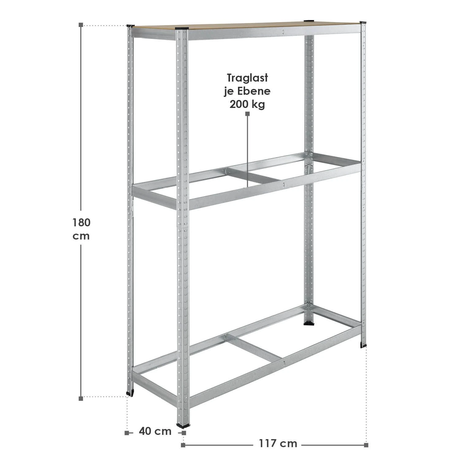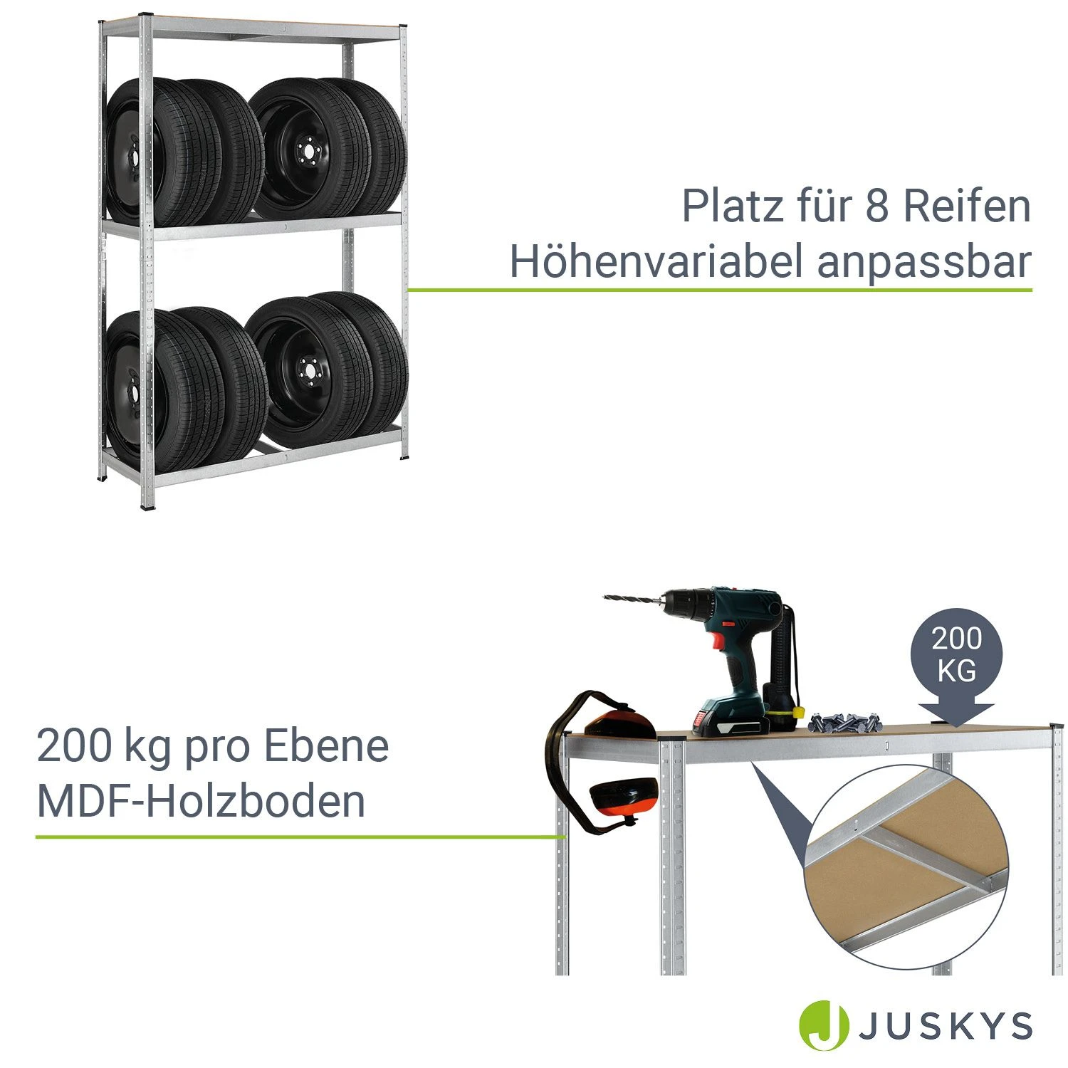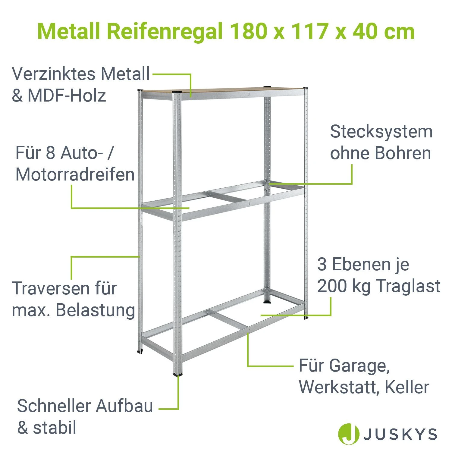 Das 180 cm hohe Lagerregal besitzt insgesamt 3 Ebenen. In den unteren beiden Ebenen lassen sich bis zu 8 Auto- bzw. Motorradreifen unterbringen: 4 Reifen oder Felgen pro Ebene. Die 117 cm breiten und 40 cm tiefen Ebenen lassen sich in ihrer Höhe variabel an die Größe Ihrer gelagerten Räder anpassen.