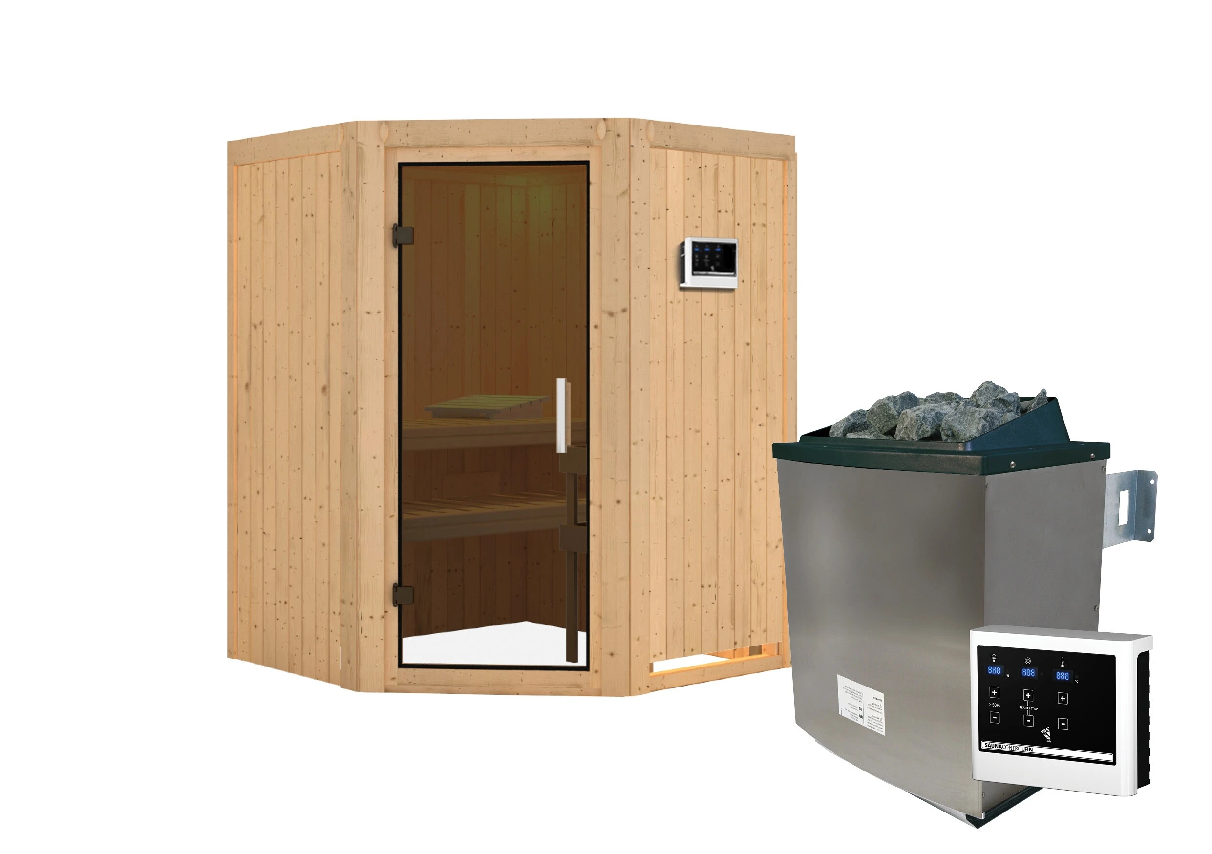 Mit der Sauna Angel können Siesich die optimale Entspannung nach Hause holen. Der Aufbau gestaltet sich durchschon vorgefertigte Bauelemente als einfach und schnell. Diese Elementsaunabietet dank ihrer Wandstärke von 68 mm und der im Wandelement eingebautenMineralwolldämmung eine hervorragende Energieeffizienz. Die vorgefertigtenWandelemente, die außen mit Softline-Profilholz verkleidet sind, sind leichterals Holz und haben gleichzeitig einen höheren Dämmwert. Die Sauna verfügt überein Außenmaß von 151 cm x 151 cm und ein Innenmaß von 136 cm x 136 cm. DasVolumen der Sauna beträgt 3,5 cbm. Durch die formschöne graue Graphittürgelangen Sie in das zum entspannen einladende Innere der Sauna mit Ihren 2einladend aussehenden Liegen. Die Liegen sind ausreichend breit bemessen undbieten Ihnen die optimale Entspannung. Die Lieferung erfolgt inkl.Ofenschutzgitter, 9kw Saunaofen, der passenden Saunasteuerung, allen benötigtenAnschlusskabeln, einer Saunaleuchte und einem Zubehörset. Zusätzlich dazu gibtes gratis ein Geschenkpaket. Unsere Elementsaunen haben 2 Sichtseiten und 2Seiten, welche mit einer Hartfaserplatte ausgestattet sind. Somit bietet dieSauna Angel perfekte Wellnessstunden ganz privat bei Ihnen zuhause.