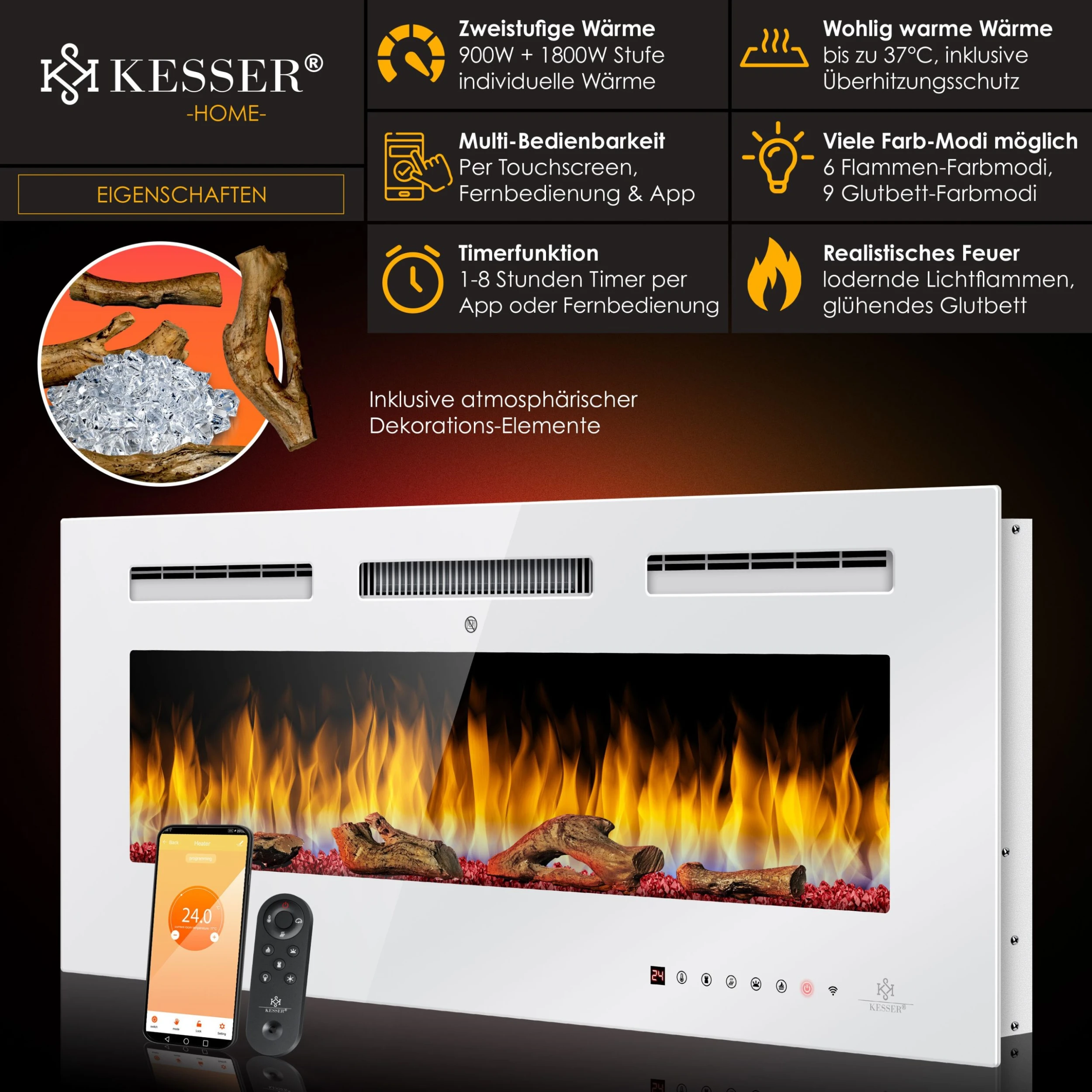 KESSER Kaminofen mit zweistufiger Wärme (900W & 1800W) bis zu 37°C, realistische Flammen, inkl. Fernbedienung, Touchscreen und WiFi App Funktion, integrierte Timerfunktion, echter Flammeneffekt mit 9 Flammen, 5 Einstellungen für die Helligkeit, Überhitzungsschutz und Kippschutzvorrichtung, einfach in oder an der Wand installieren