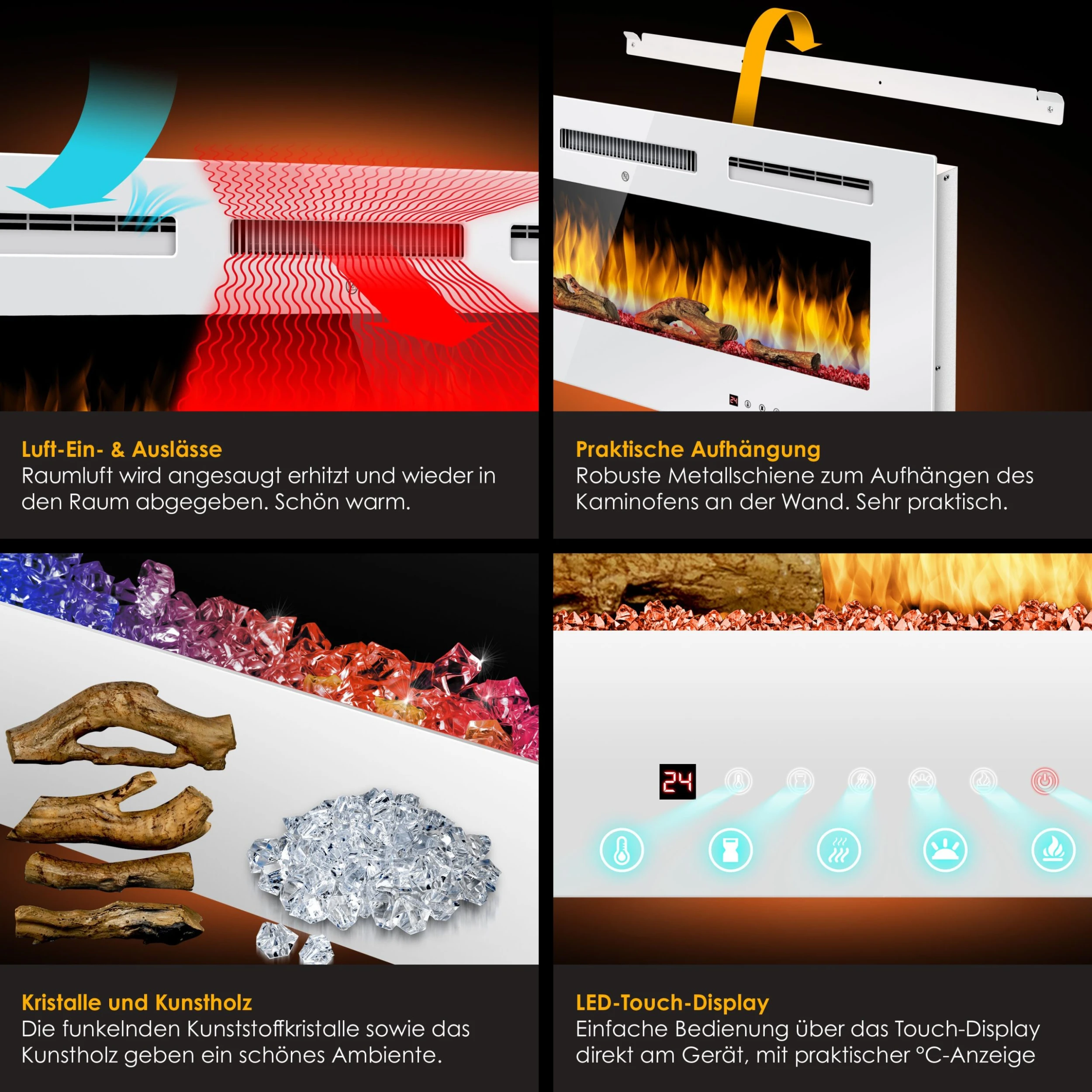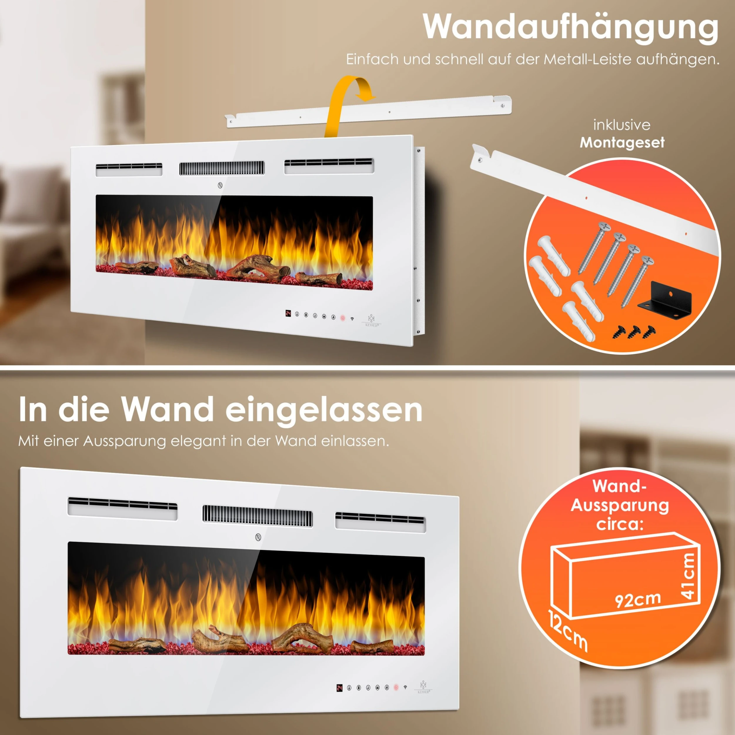 Mit der mitgelieferten Wandaufhängung können Sie den Heizkörper schnell und unkompliziert auf der Metall–Leiste aufhängen. Alternativ haben Sie die Möglichkeit, den elektrischen Kamin in einer Aussparung in Ihrer Wand zu platzieren.