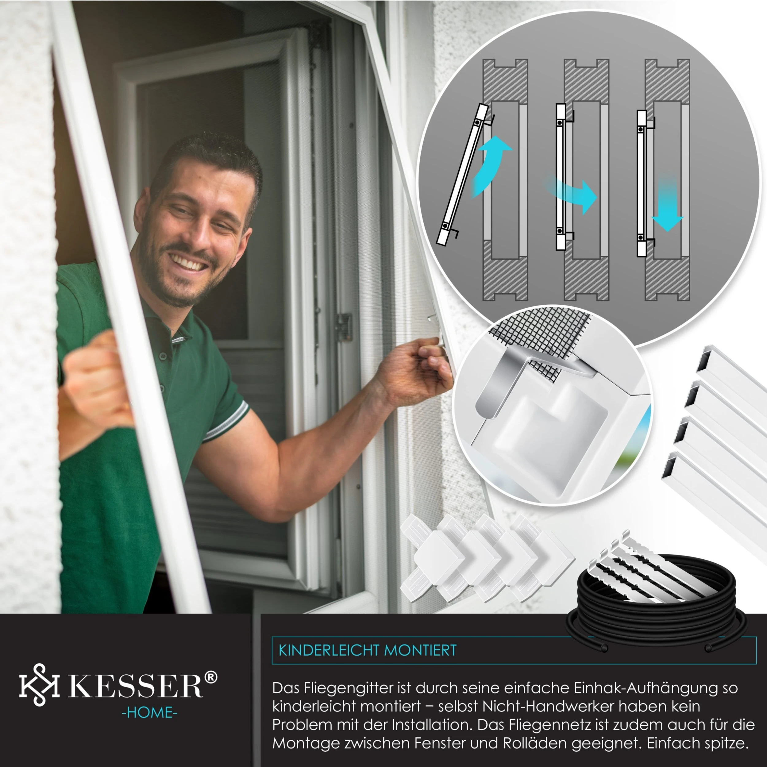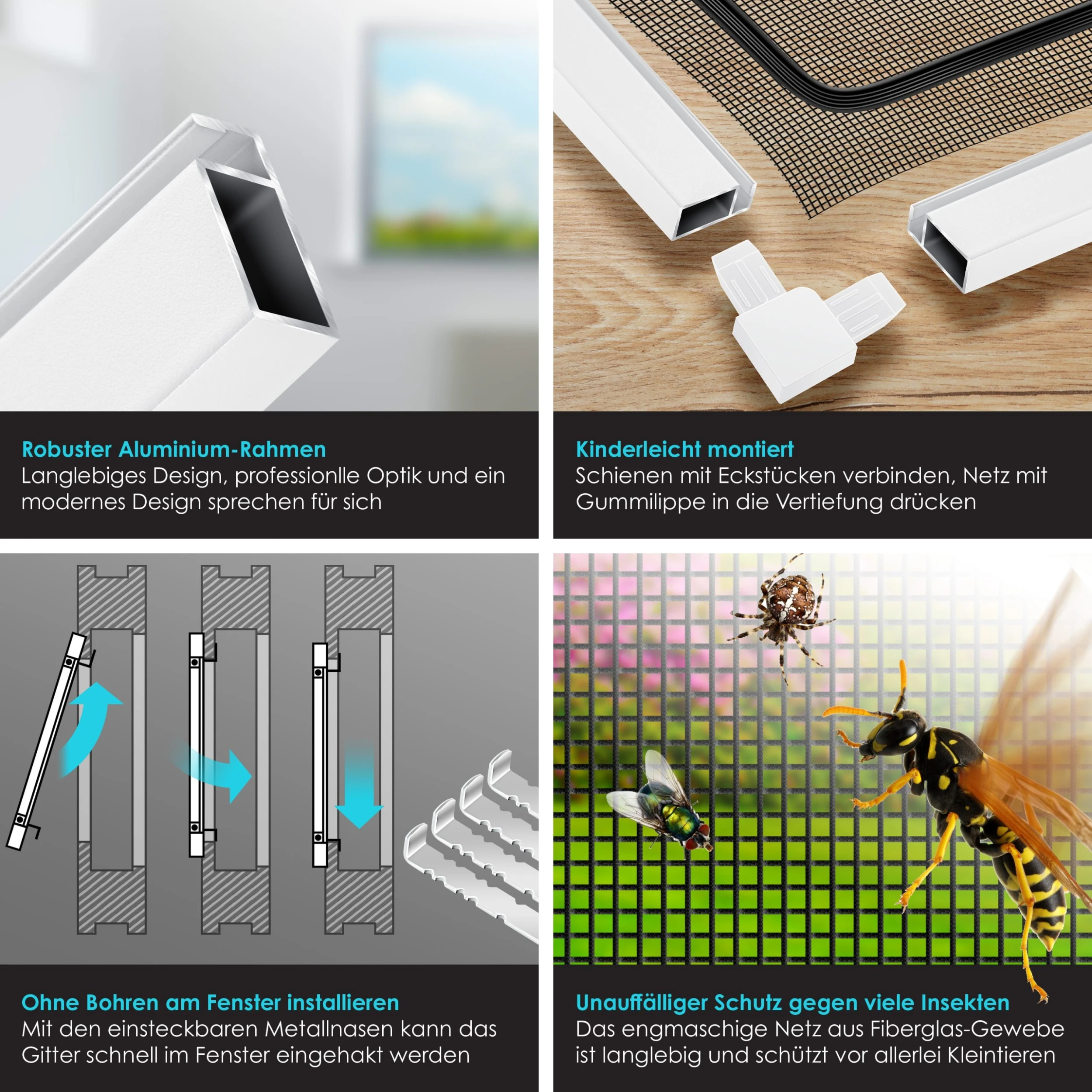 Der Bausatz kann an fast allen Standard–Fenstern montiert werden und bietet einen zuverlässigen Schutz vor Stechmücken, Fliegen und weiteren Insekten. Mit Hilfe eines patentierten Befestigungssystems klemmen Sie das Fliegengitter an den bestehenden Fensterrahmen, ohne diesen zu beschädigen, da kein Bohren oder Schrauben erforderlich ist. Der Aufbau der Fliegengitterrahmen ist auch für Nicht–Handwerker einfach umzusetzen, die Eckverbinder werden in die Aluminiumprofile gesteckt und sorgen so für zusätzliche Stabilität. Auch für Montage zwischen Fenster und Rollladen geeignet.
