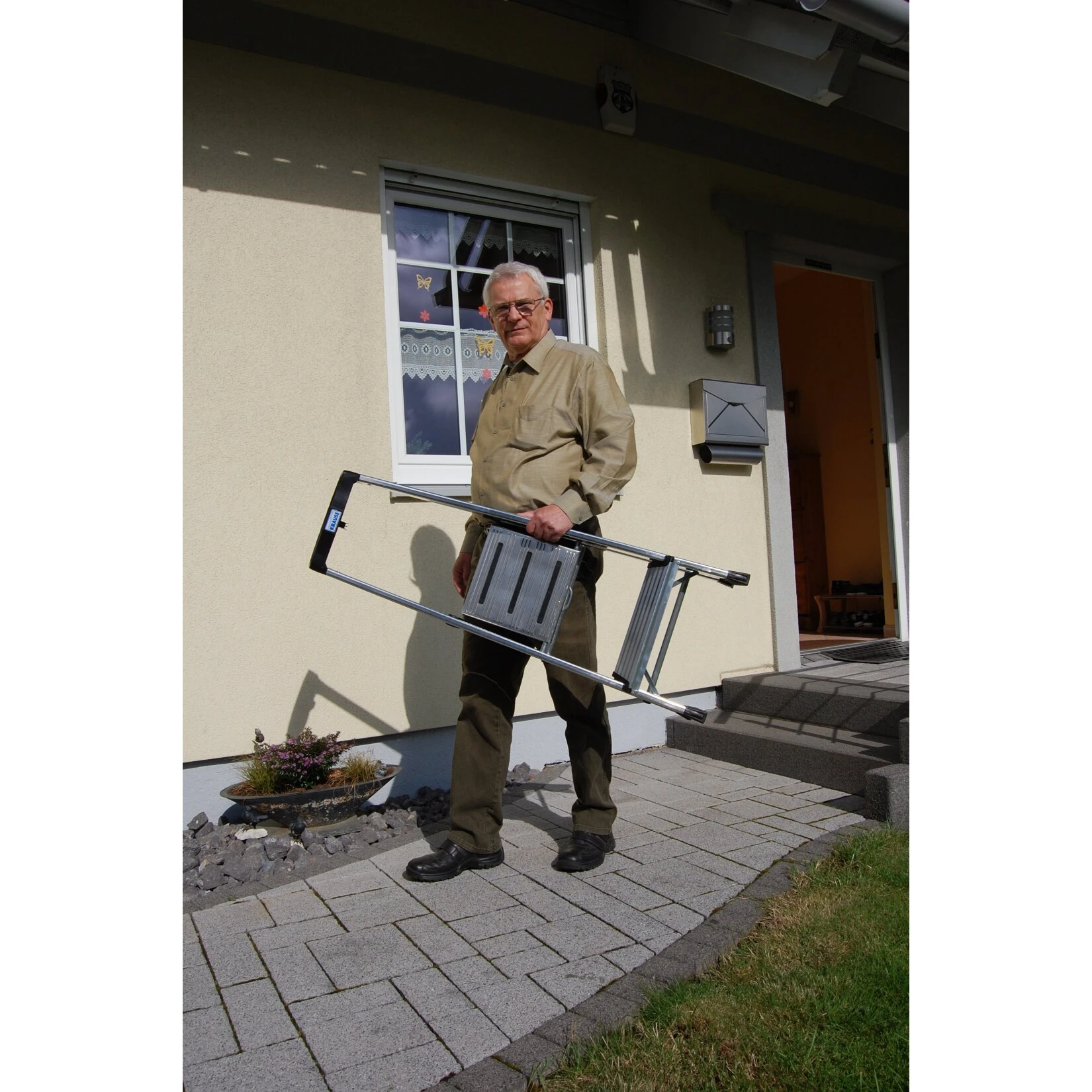 Die leichte und kompakte Aluminium-Stehleiter mit extra hohem Sicherheitsbügel und extra tiefer Stufe gewährleistet leichtes Handling und sicheren Stand.