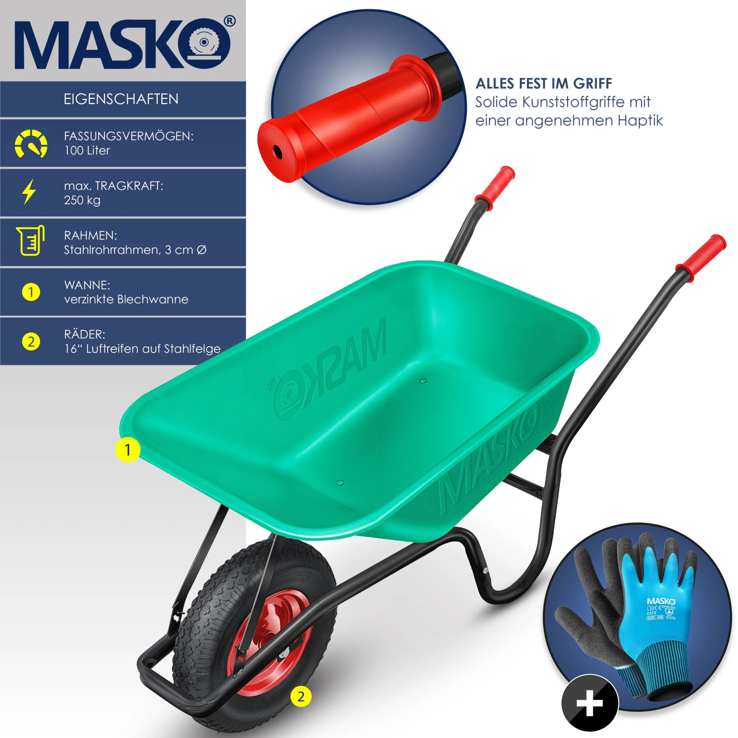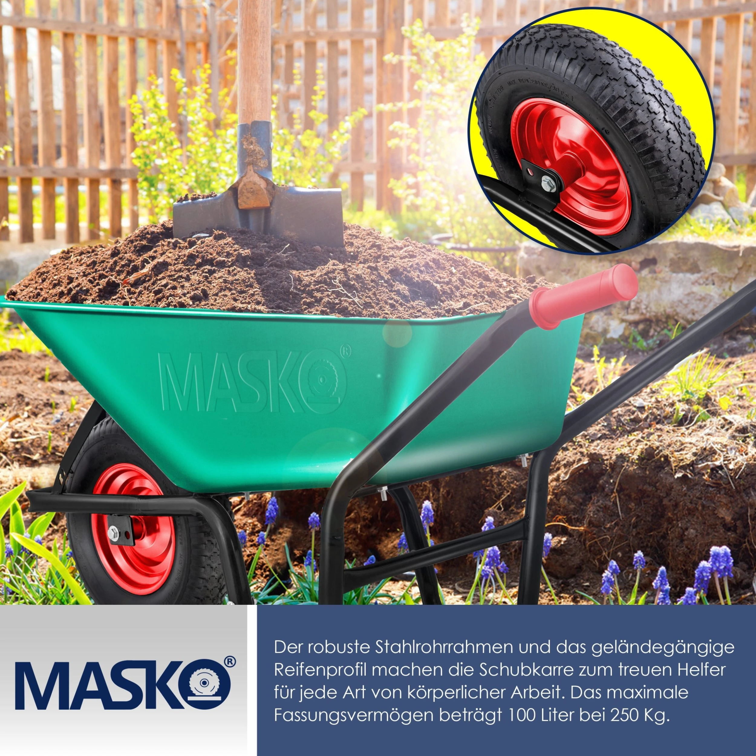 Die Schubkarre aus dem Hause MASKO besitzt ein Fassungsvermögen von 100 Litern und kann eine maximale Traglast von 250 Kilogramm bewältigen. Für eine sichere Fahrt – auch über ein schwieriges Gelände – wie zum Beispiel Schotter und Schlamm, sorgt das luftgefüllte Rad mit einer Größe von 16 Zoll und einem gut haftenden Stollenprofil. Die Wanne besteht aus einem verzinktem Rahmen und Radfelgen aus pulverbeschichtetem Stahl.