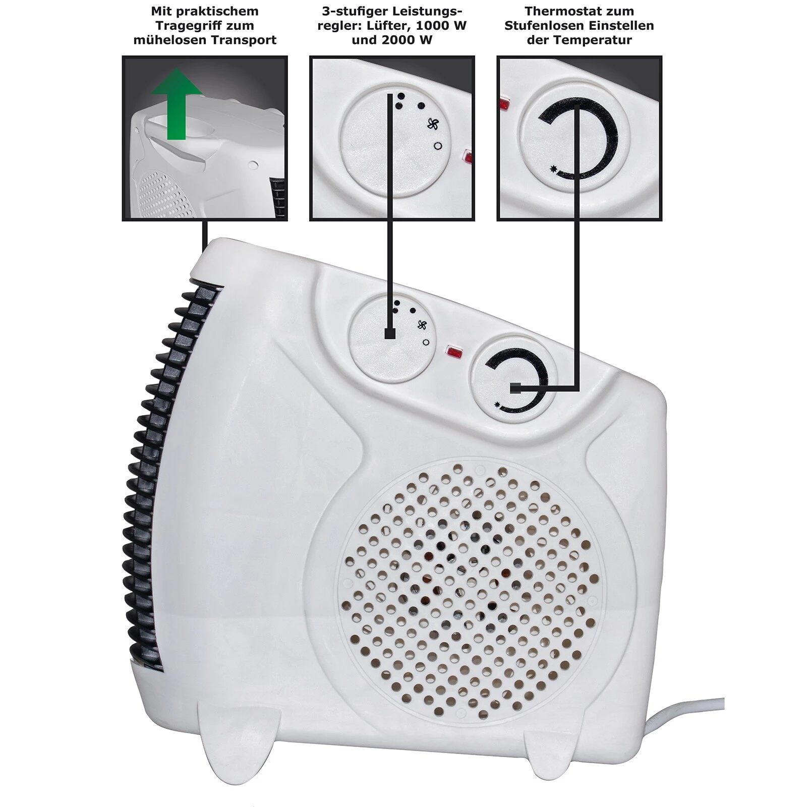 - 3 Stufen ( Ventilator, Heizen 1000 W, Heizen 2000 W )