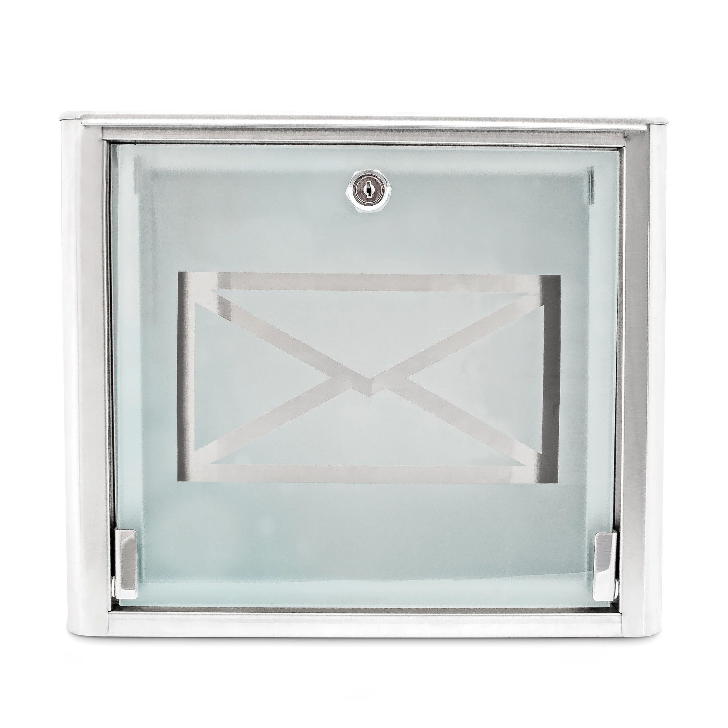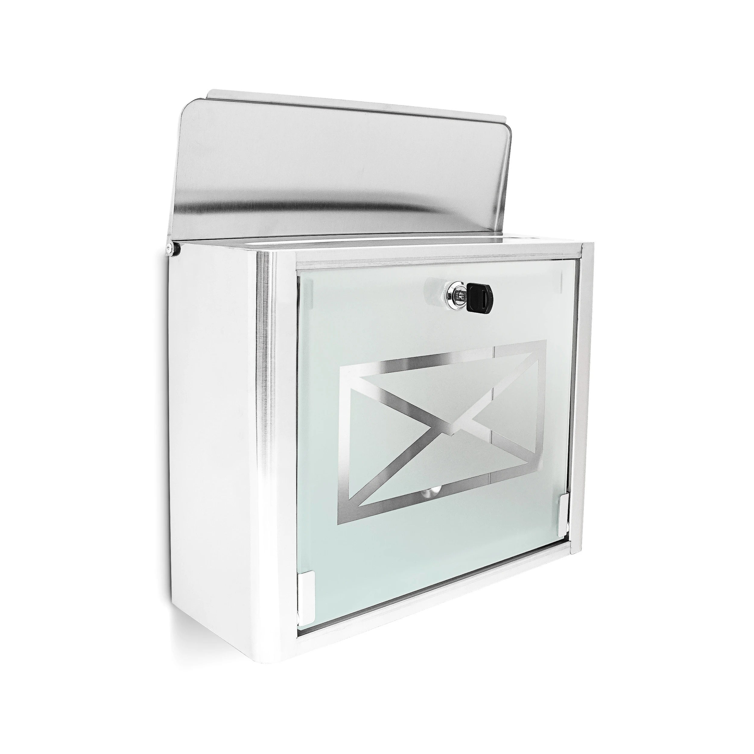 Der Materialmix aus Edelstahl und Milchglas gibt dem Briefkasten eine moderne Erscheinung. Die große Milchglastür mit Dekomotiv eines Briefumschlages aus Klarglas lässt ihn zum echten Hingucker werden. Gleichzeitig können Sie so immer sehen, ob der Postbote auch für Sie etwas da gelassen hat, ohne den Briefkasten unnötig zu öffnen.