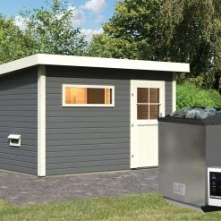 Karibu Saunahaus “Ekiti” SET Terragrau Mit Ofen 9 KW Bio Ext. Strg., Kabel, Dachfolie