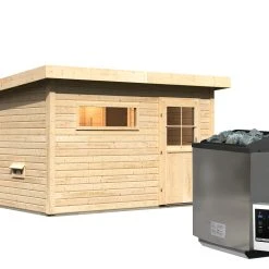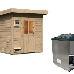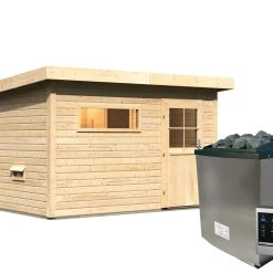 Karibu Saunahaus “Ondo 1” SET Naturbelassen Mit Ofen 9 KW Bio Ext. Strg, Kabel, Dachfolie, Fenster