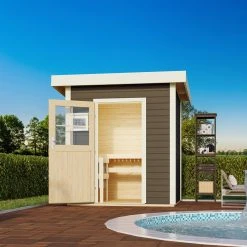 Karibu Saunahaus “Ondo 1” SET Terragrau Mit Ofen 9 KW Ext. Strg, Kabel, Dachfolie, Fenster