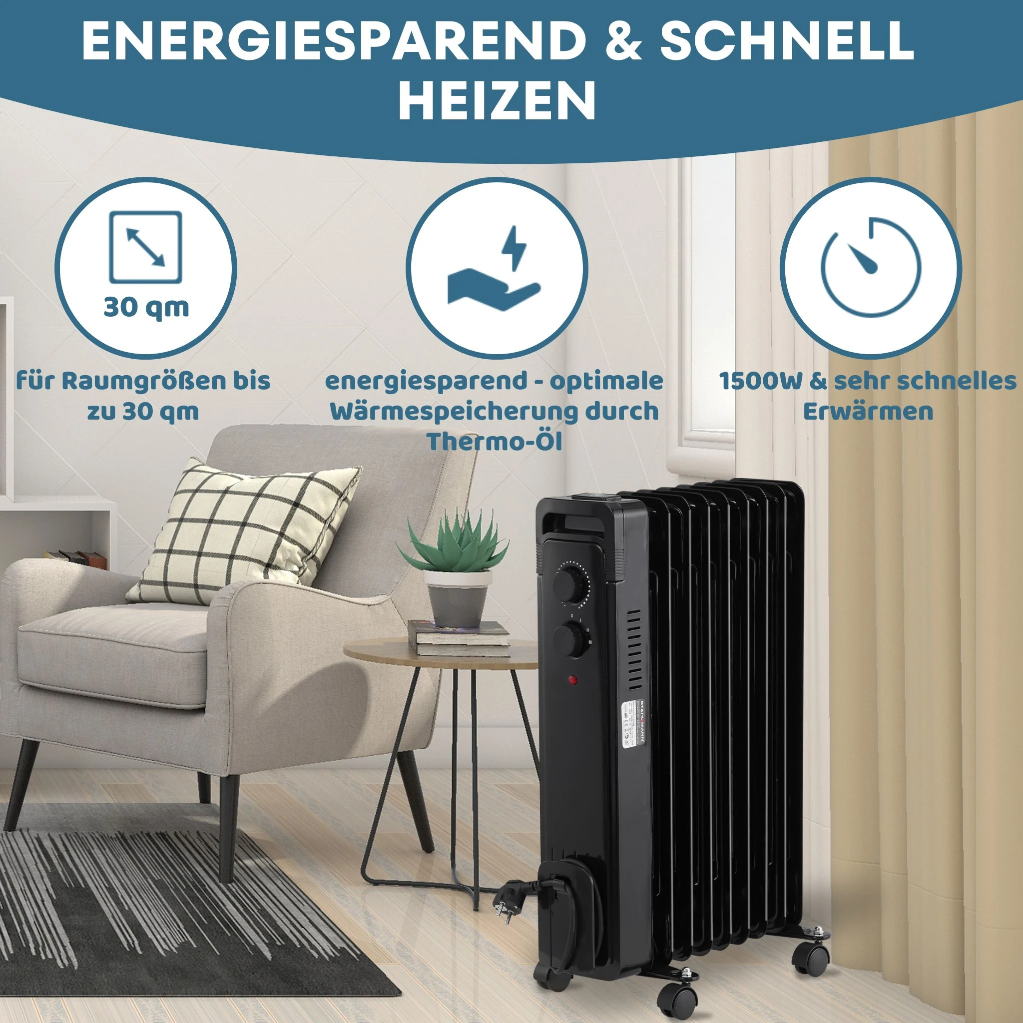 ENERGIESPAREND HEIZEN: Unser Ölradiator erhitzt ein Thermoöl mit sehr guter Wärmespeicher-Eigenschaft. Dadurch ist er äußerst energiesparend und nachhaltig.