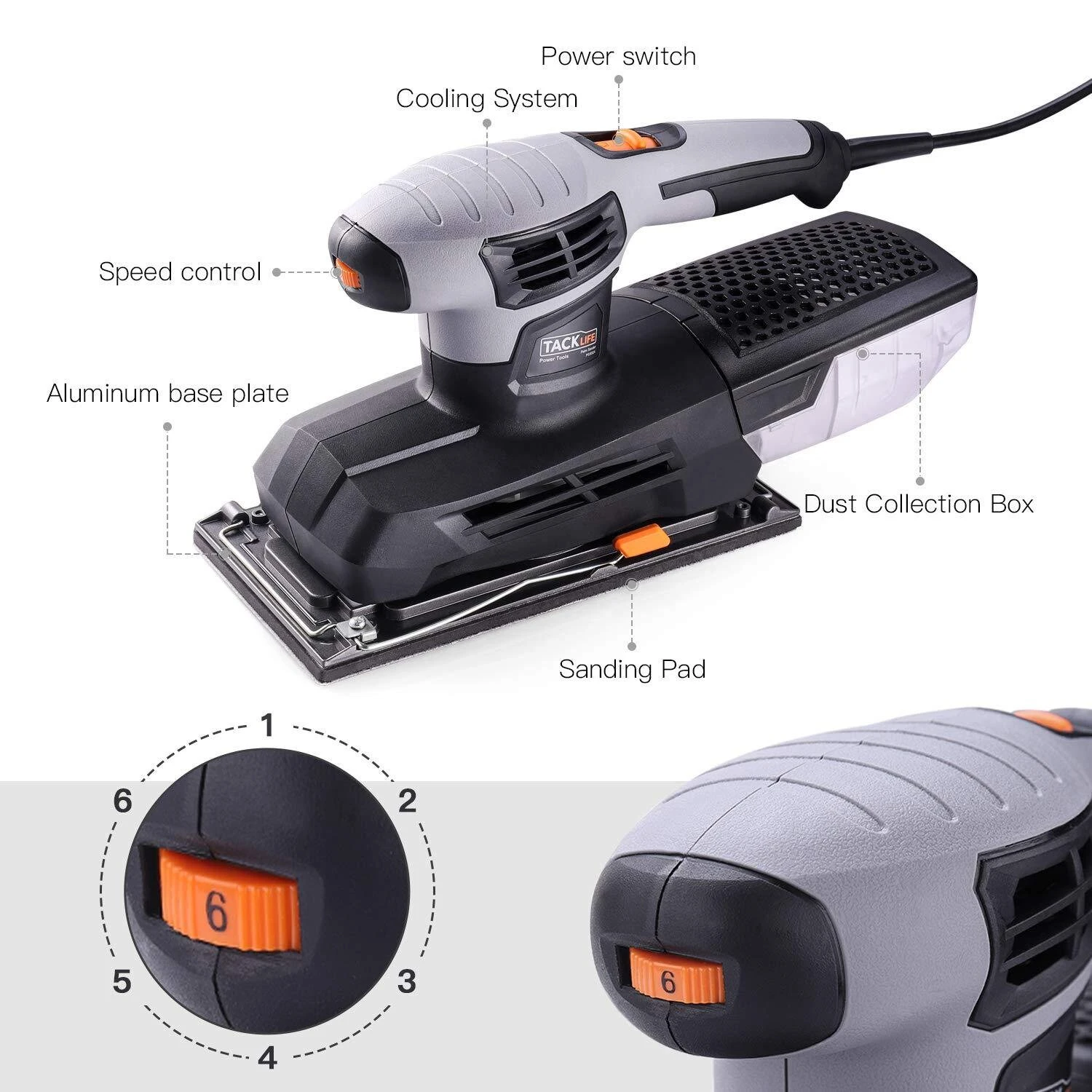 GROSSE SCHLEIFBASIS & EINSTELLBARE GESCHWINDIGKEIT – Der TACKLIFE 1/2 Orbital Sheet Sander verfügt über eine große Schleifbasis von 9×4,5 Zoll (230×115 mm). Der 6-stufige alternative Geschwindigkeitsregler ermöglicht eine variable Steuerung der Geschwindigkeit. Bequem, um die geeignete Geschwindigkeit für verschiedene Arbeiten wie Sie erforderlich einzustellen.