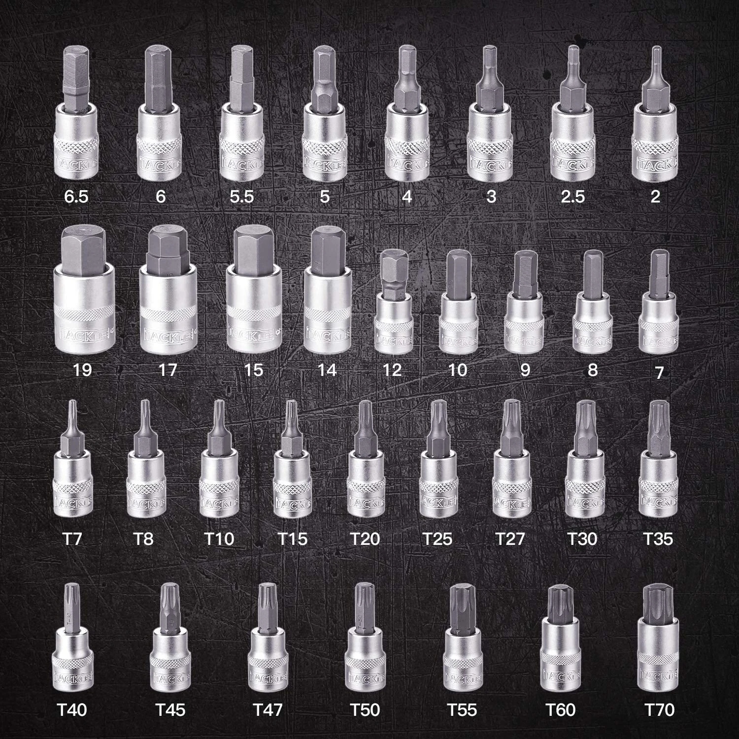??33 PCS INCLUDE?:16-teilige Torx-Stern-Bit-Einsätze:1/4″ T7-T8-T10-T15-T20-T25-T27-T30-T35;3/8″ Torx-T40-T45-T47-T50-T55;1/2″ T60-T70;16-teilige Sechskant-Bit-Einsätze beinhalten: 1/4″ 2-2.5-3-4-5-5.5-6-6.5MM;3/8″ 7-8-9-10-12MM;1/2″ 14-15-17-19MM.