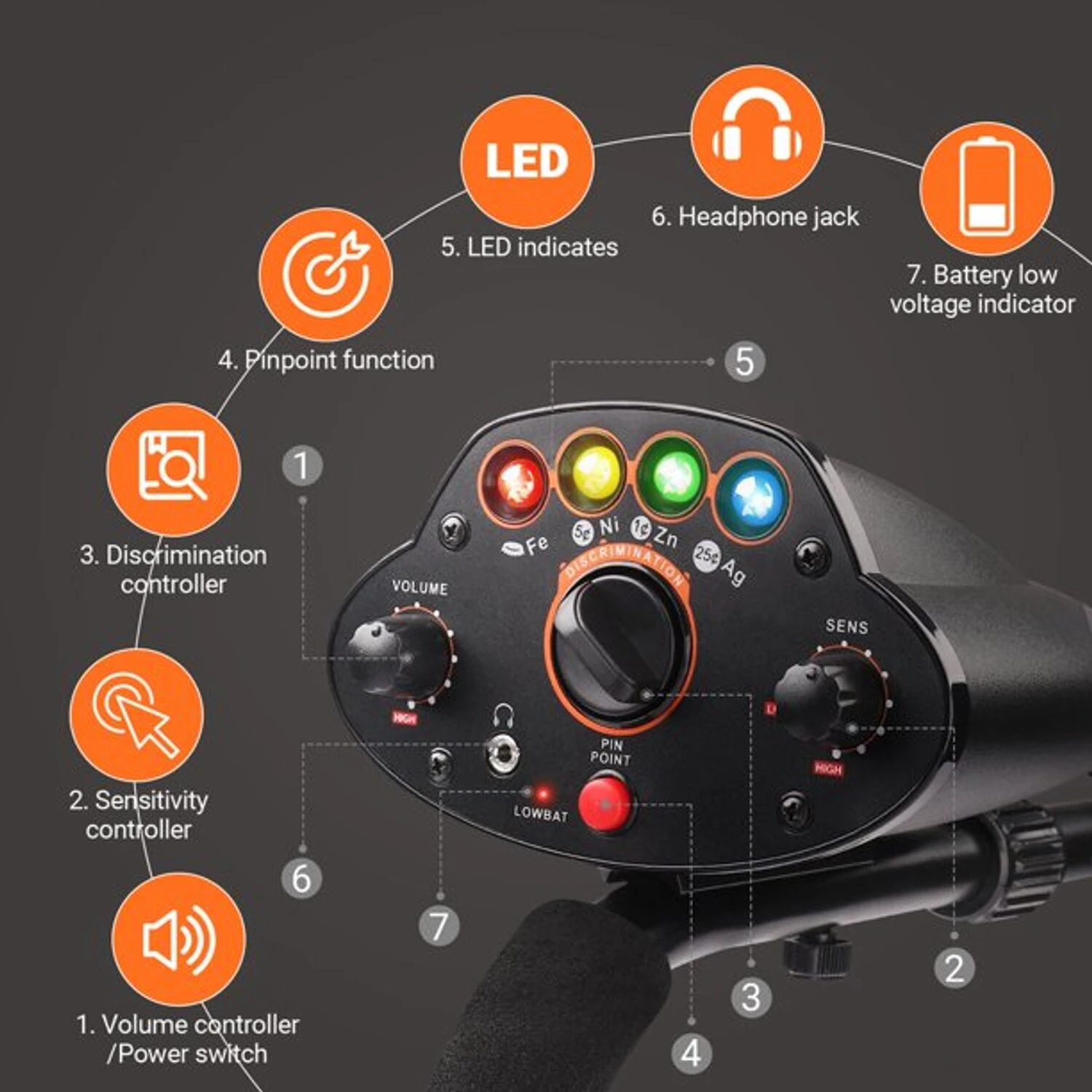 SOUND & SENSITIVITY CONTROLLER– Lautstärkeregler (wird auch als Netzschalter verwendet), die Lautstärke erreicht das Maximum, wenn sich der Regler im Uhrzeigersinn dreht. Auch mit 1/8-Zoll-Kopfhörerbuchse ausgestattet. Die Empfindlichkeit ist am geringsten, wenn gegen den Uhrzeigersinn bis zum Ende gedreht wird. Bei der Zielsuche kann die Empfindlichkeit auf eine höhere Position eingestellt werden