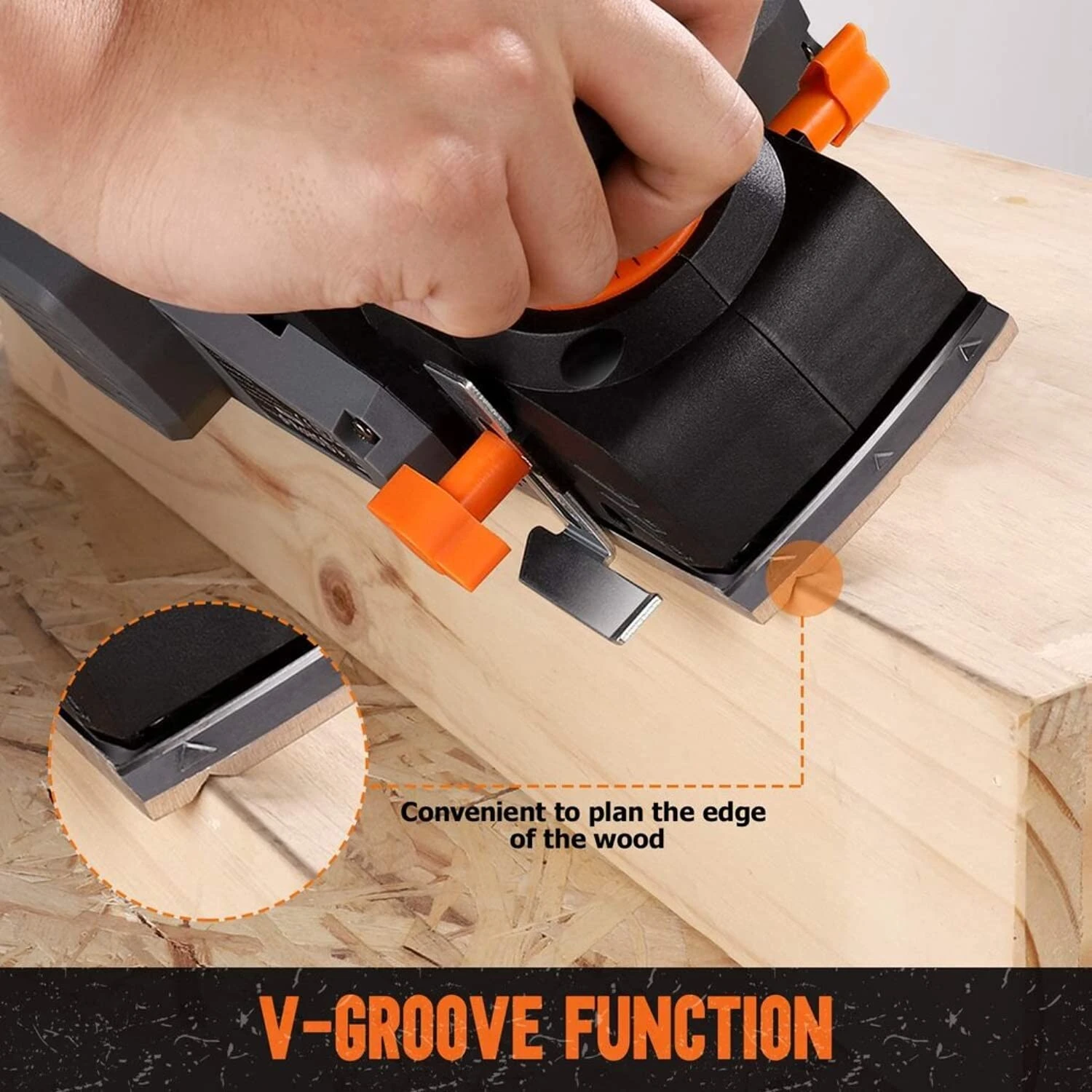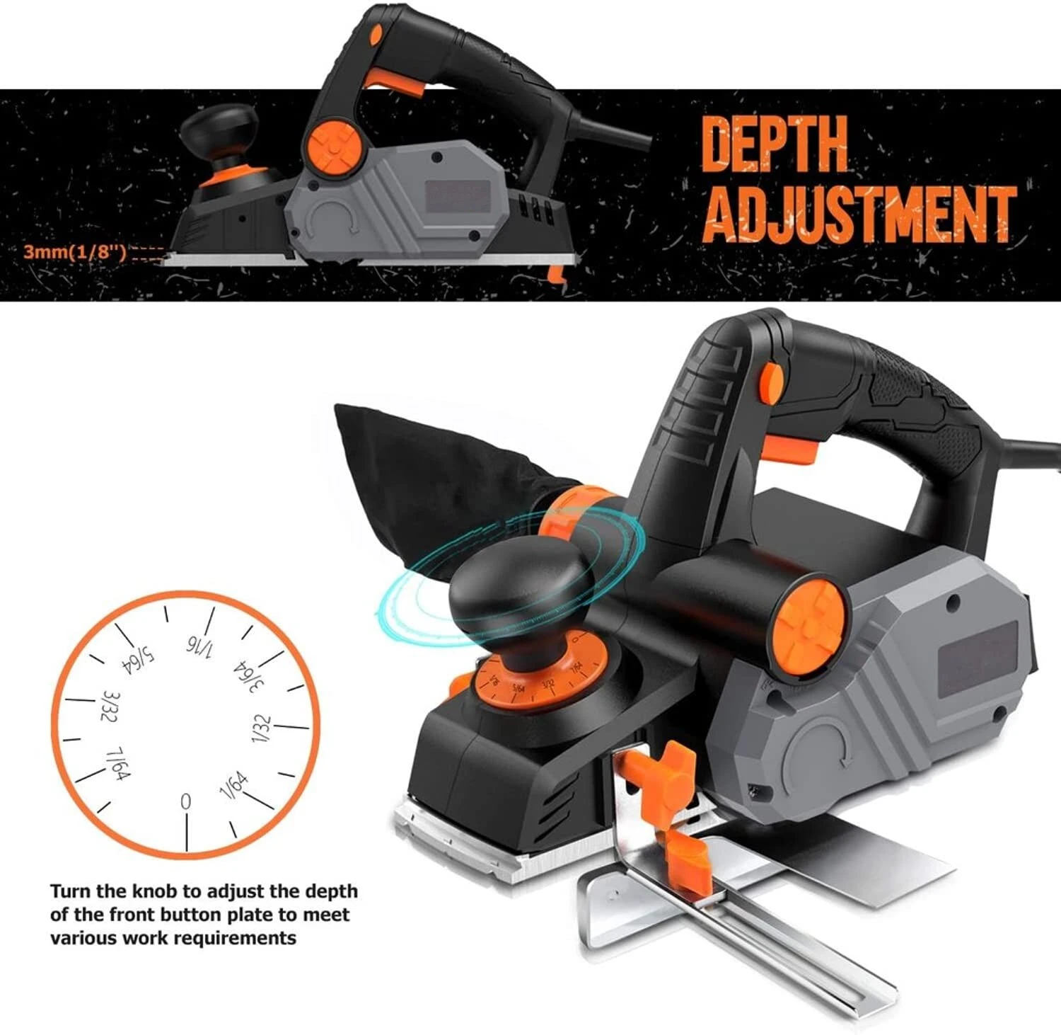 HOHE GENAUIGKEIT: Der Ratschen-Tiefenknopf mit 15 positiven Anschlägen ermöglicht eine narrensichere Einstellung von Tiefenschritten von 0 Zoll bis 1/8 Zoll (3 mm) innerhalb einer Umdrehung, sodass die Tiefe nicht neu auf Null gestellt werden muss. Mit diesem Elektrohobel können Sie eine Vielzahl von Projekten mit maximaler Präzision angehen, und das Werkzeug verfügt über 3 bearbeitete Nuten zum Anfasen. Die verstellbare Falzführung hilft beim Hobeln der Falze von 0 bis 1 Zoll