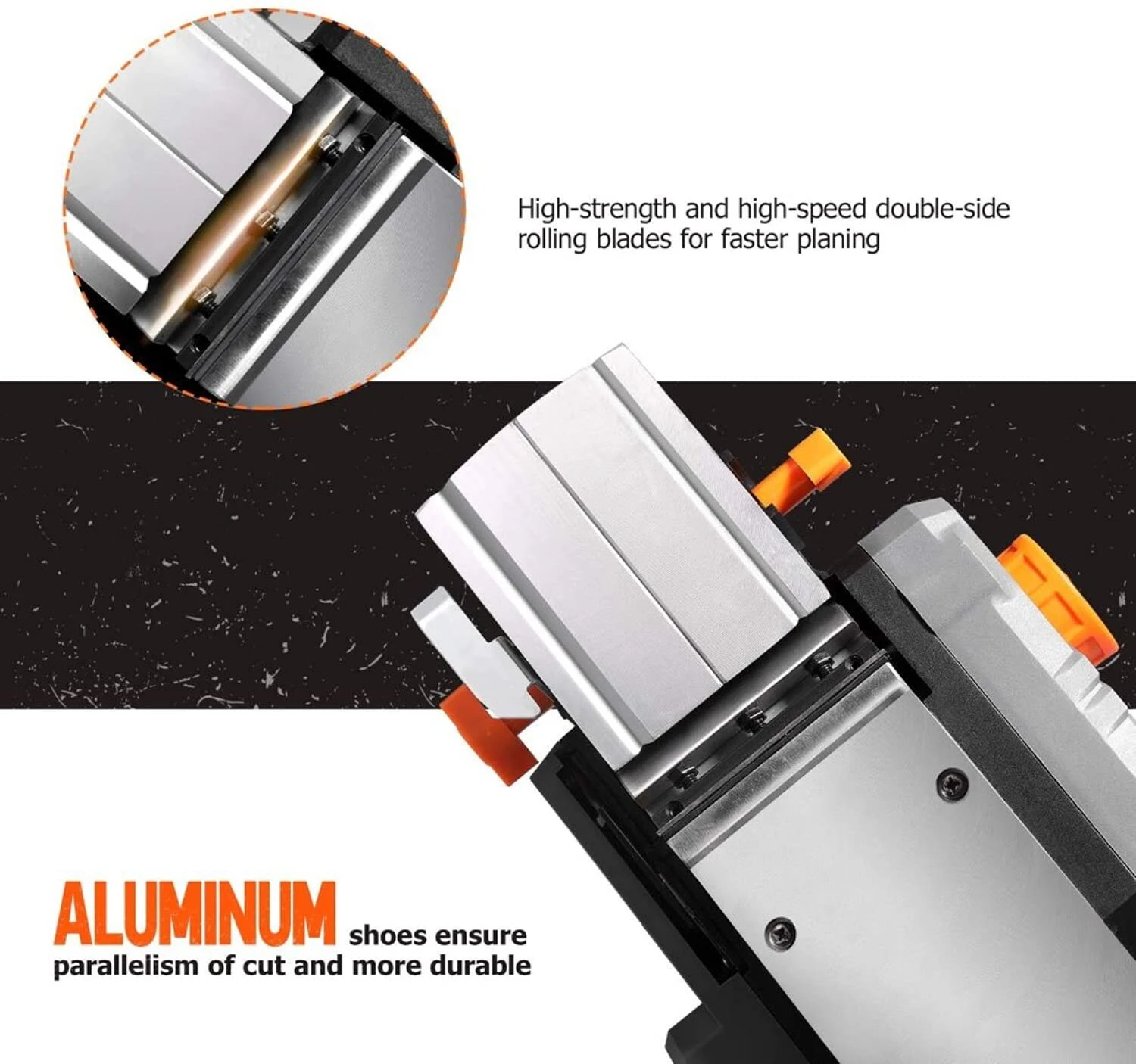HALTBARKEIT & SCHUTZ: Die vorderen und hinteren Aluminiumschuhe verformen und rosten nicht, halten länger als Eisenschuhe auf anderen Holzhobeln und sorgen für Parallelität des Schnitts. Und der Gummiantriebsriemen sorgt für eine verbesserte Riemenhaltbarkeit; Der federbelastete Ständer hebt das Werkzeug an, um Klingen und Werkstück zu schützen. Die Verriegelungstaste für Dauerbetrieb, während versehentliches Starten verhindert wird