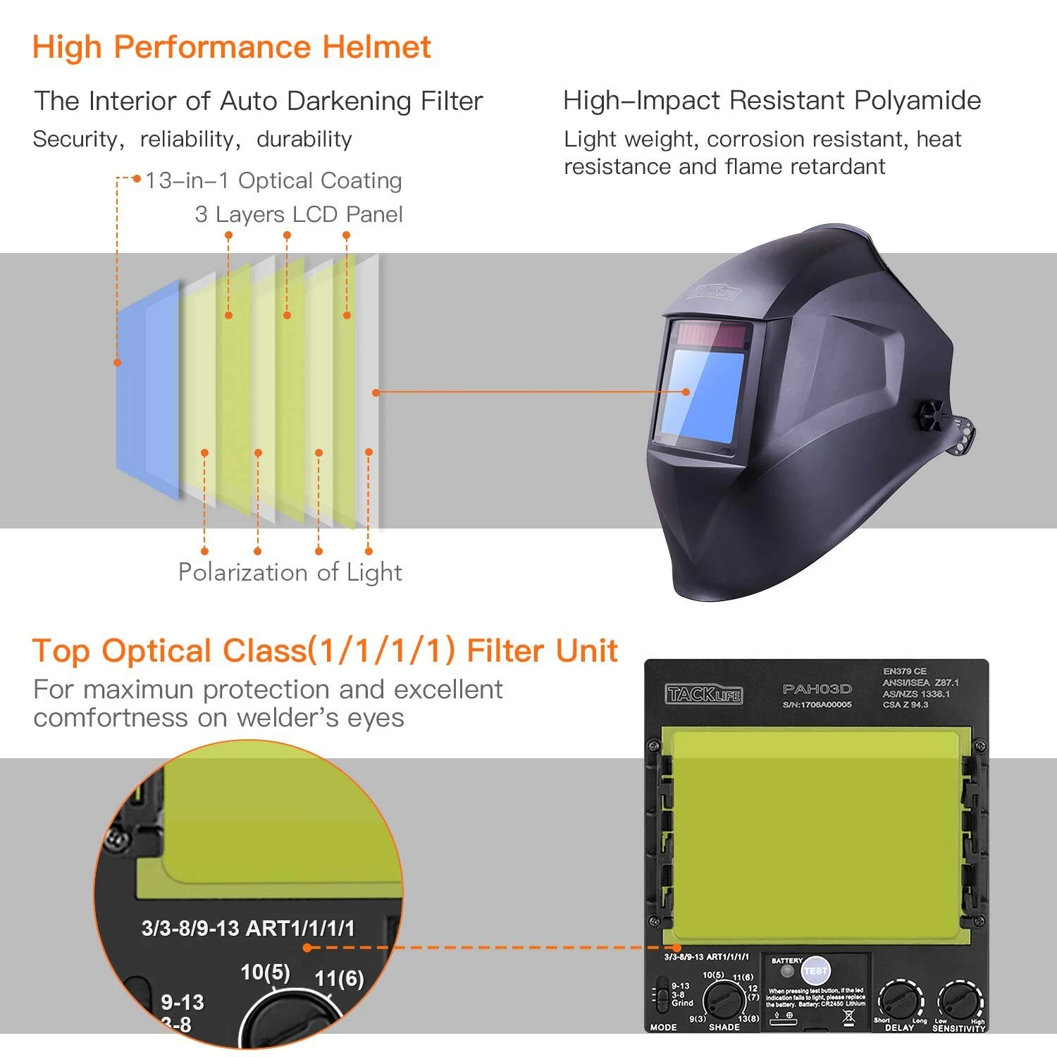 TACKLIFE Schweißhelm mit hervorragender Leistung. Top optische Klarheit 1/1/1/1: Die meisten Hersteller haben 1/1/1/1 noch nicht erreicht, besonders in den USA. Aber TACKLIFE Schweißhelm hat es geschafft.